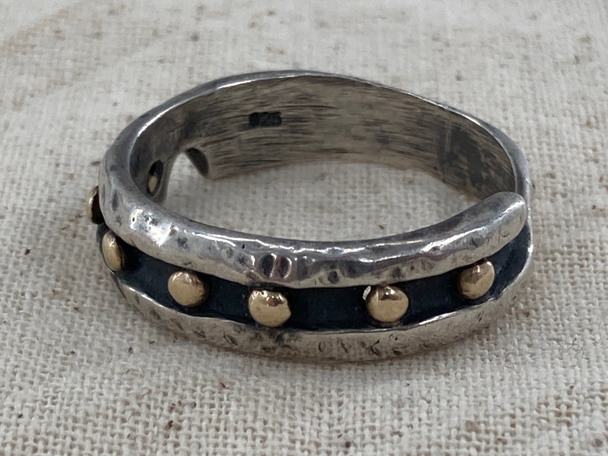 This Sterling Silver ring sports 7 balls of 14K Gold. This ring is a rescue. Came to us in a bag meant for scrap from an estate sale. Nothing wrong with this ring, no one wanted it. We cleaned it up and gave it the glamor photo shoot in hopes it can find a loving new home.