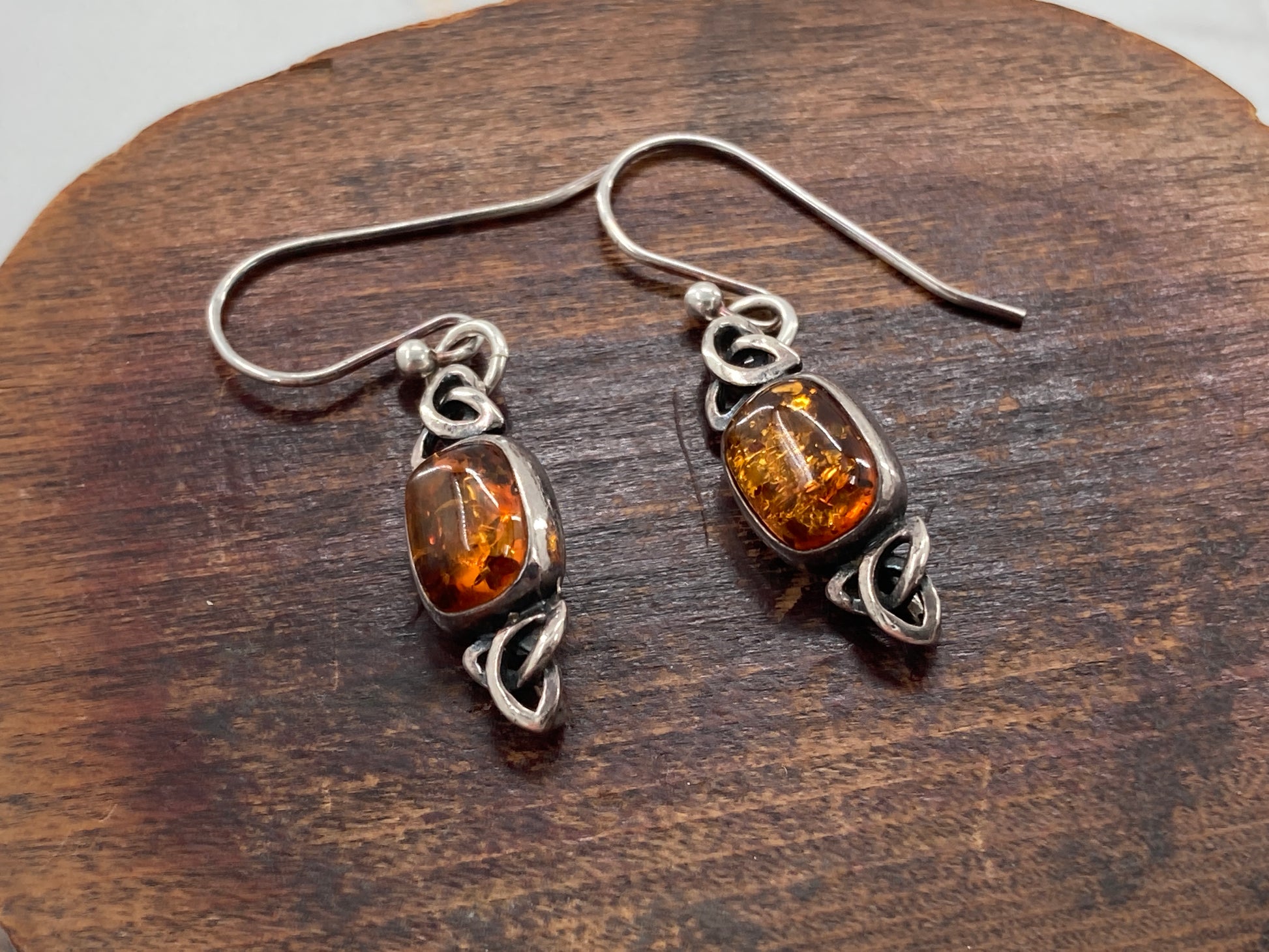 These earrings are made from a broken bracelet. The stones are Baltic Amber. Set in Sterling Silver and sporting a Trinity Knot on each end of the Baltic Amber stones. We set these earrings on timeless French Hook ear wires to give it the sway they deserve.