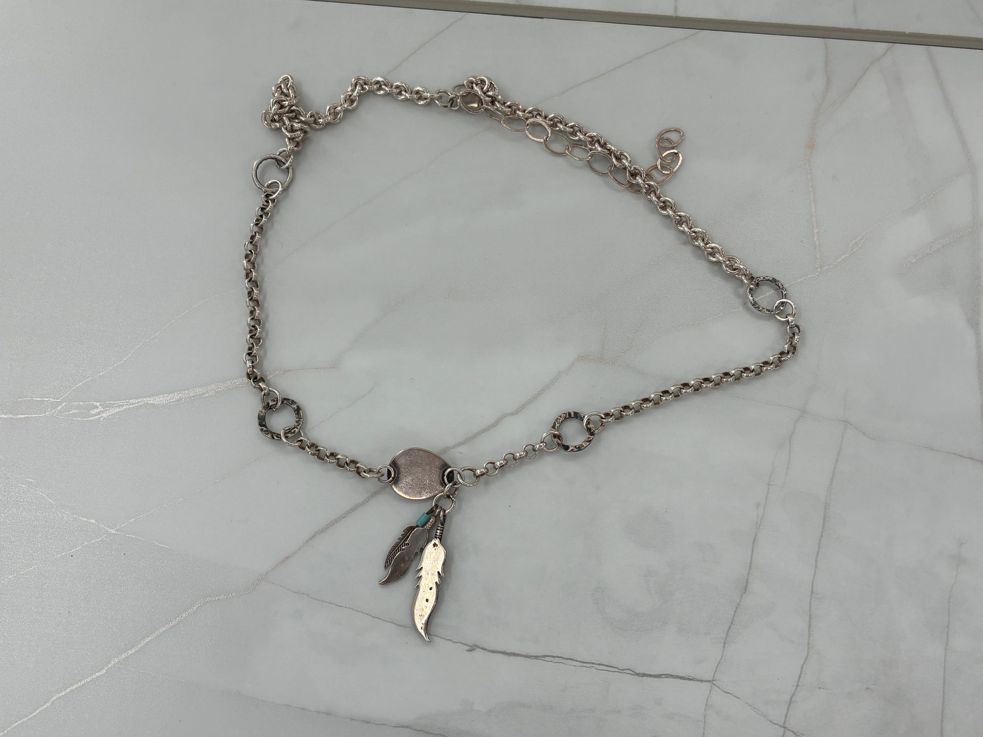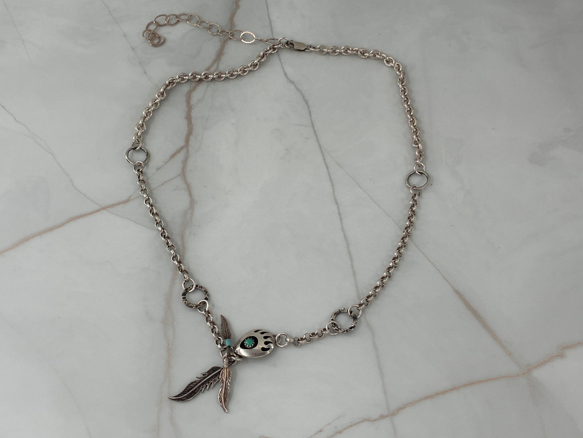 This necklace is made by combining a few scrapped items together.... the chain is made of two broken necklaces. One necklace was .925 Silver, and the other was .999 Silver. Notice the different styles and shiny finishes. We added a bear claw charm with a dab of Turquoise to make the center. Then we hung a few feather charms for some extra character. This necklace weighs in at 25.8 grams, and is 23 inches long. There is a lobster claw clasp for closure, and an extender to adjust the necklace.