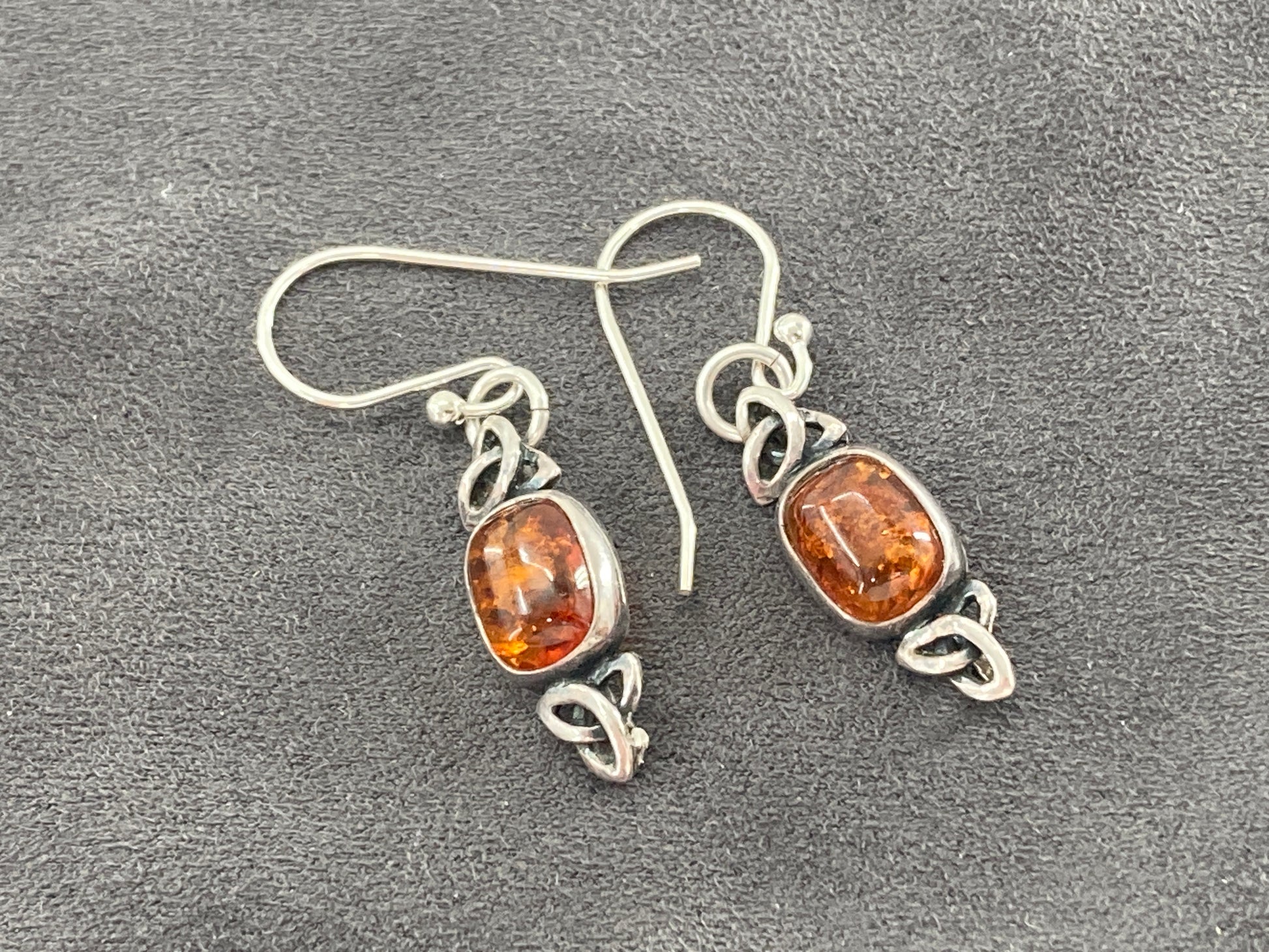 These earrings are made from a broken bracelet. The stones are Baltic Amber. Set in Sterling Silver and sporting a Trinity Knot on each end of the Baltic Amber stones. We set these earrings on timeless French Hook ear wires to give it the sway they deserve.
