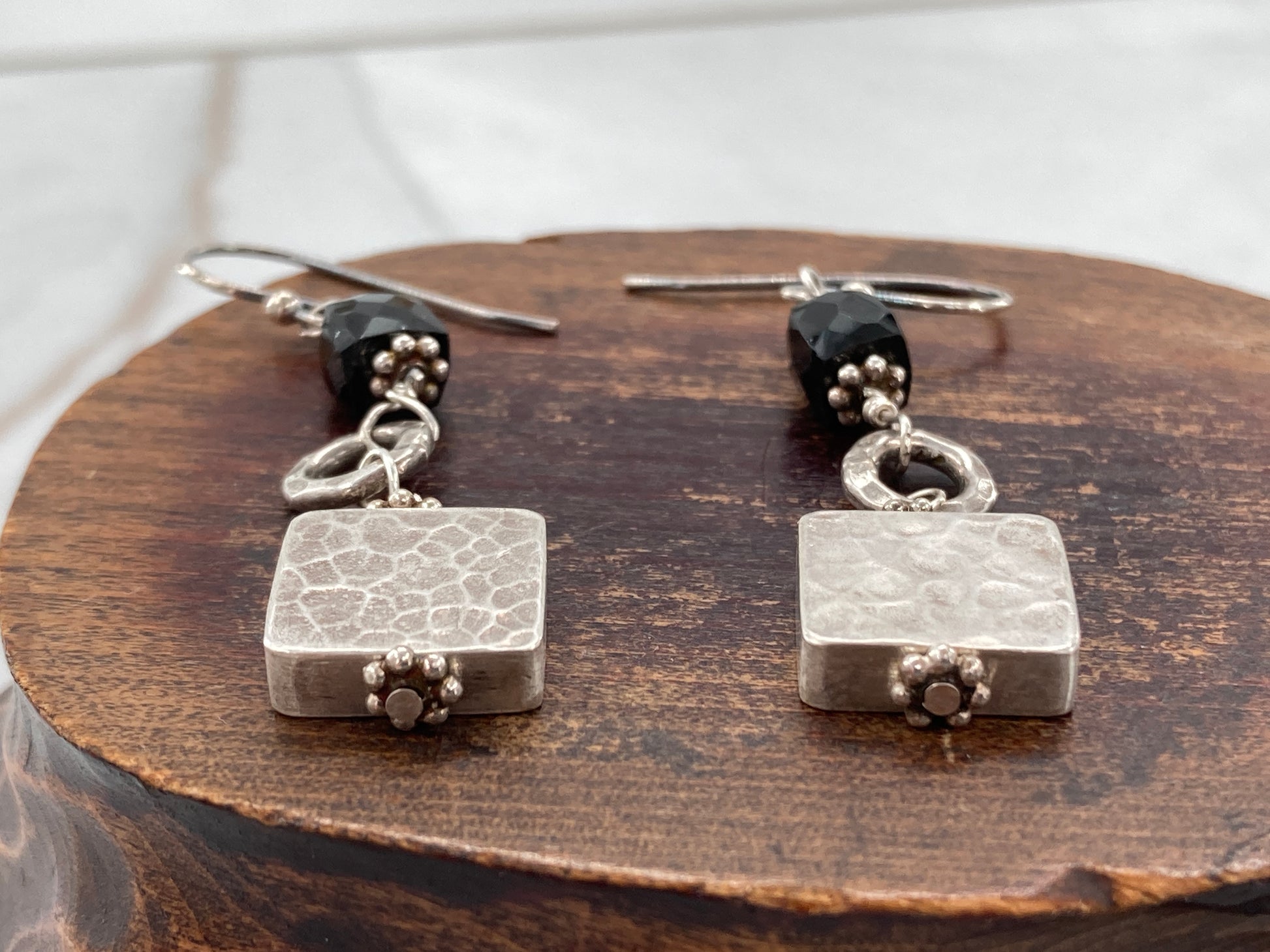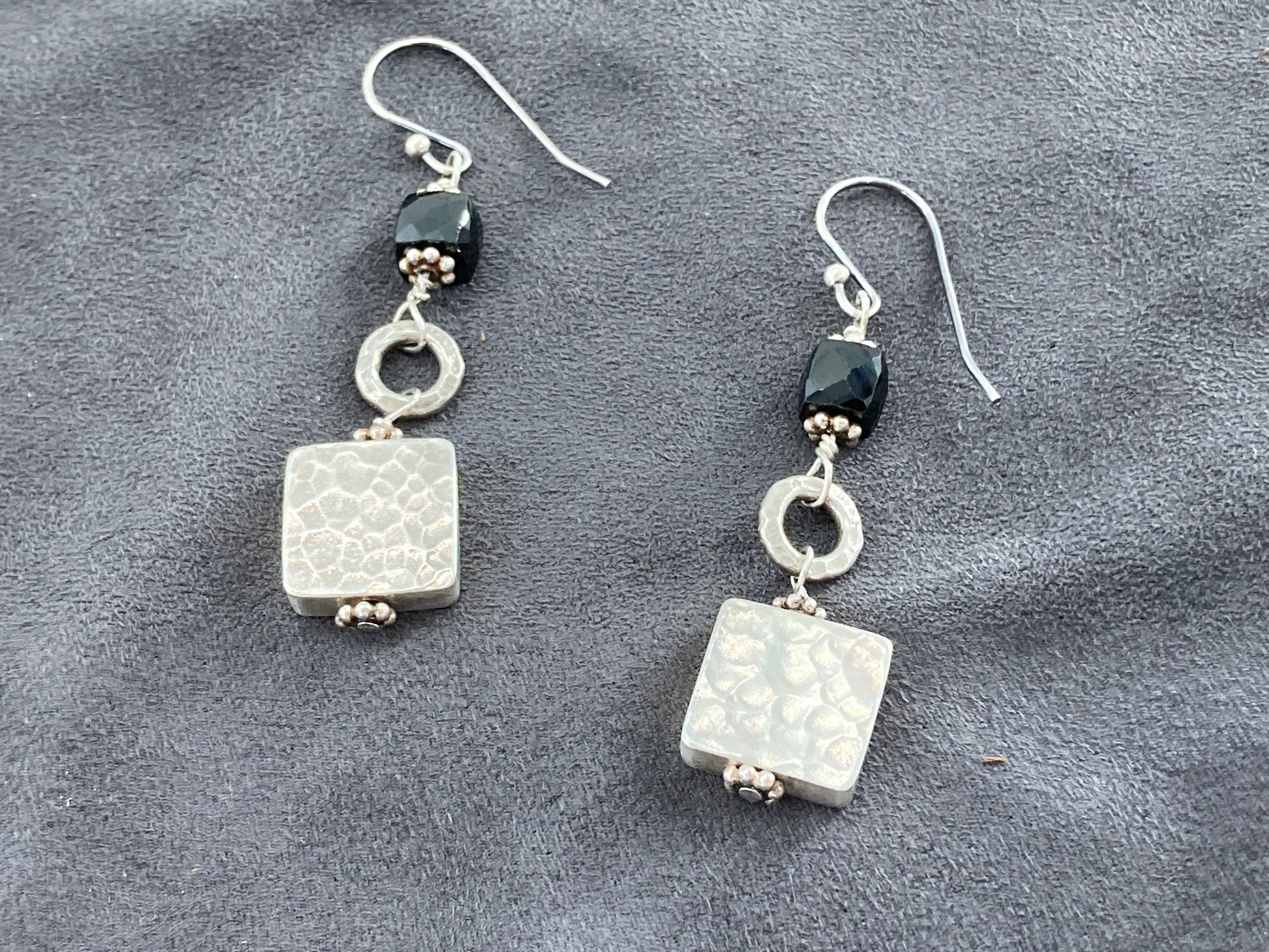 These Black Jet beads and Sterling Silver circles were originally part of a bracelet. Came to us broken beyond repair so we took it a part a bit further and made earrings out of it. Adding timeless French Hook ear wires they sway like no other. Keep an eye out for the sister pairs!