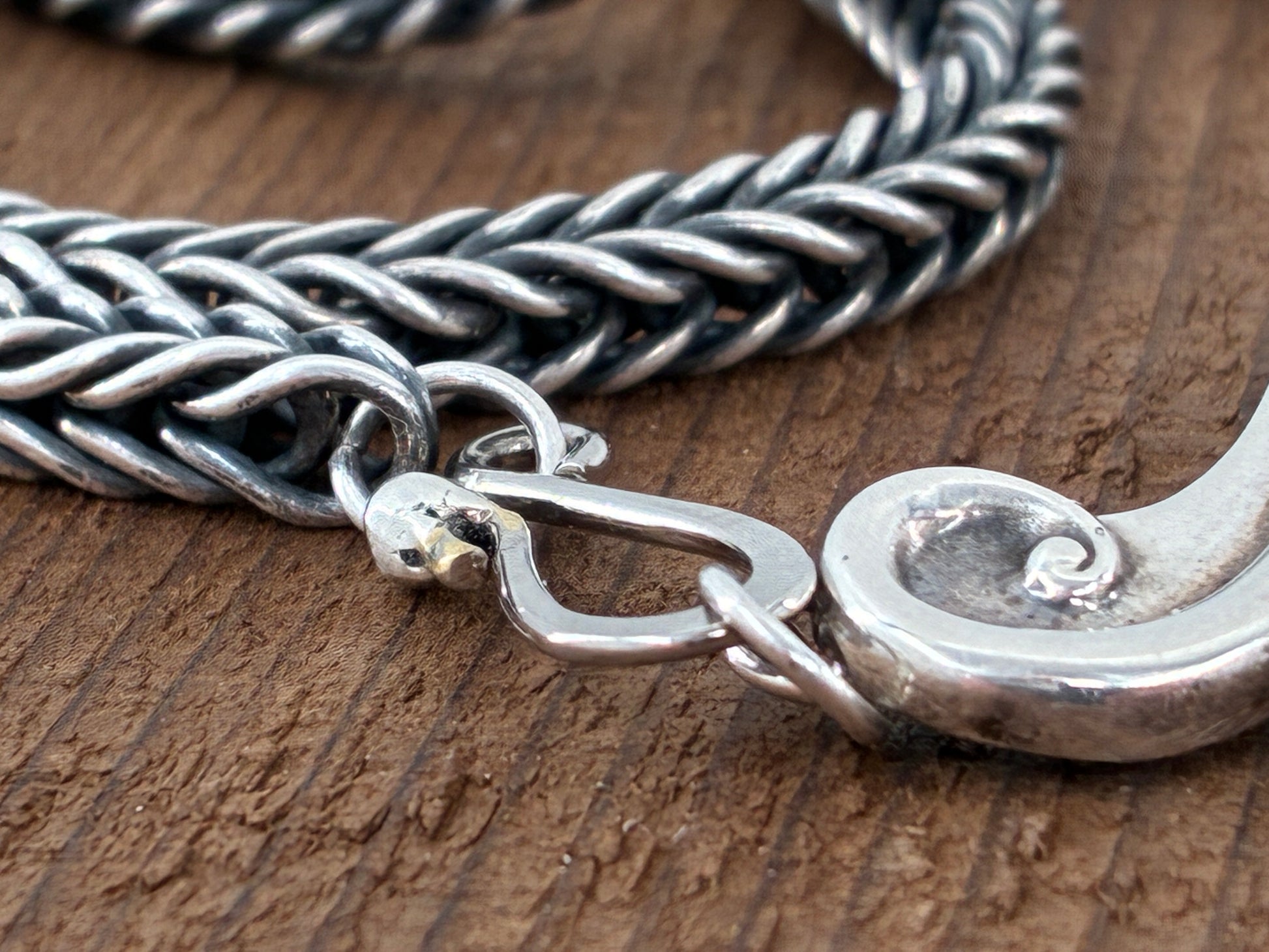 The centerpiece of this necklace is a rescued Artisan piece made by Carolyn Pollack. We took it and added some beautiful stones from earrings and bracelets that were broken. The full length of this necklace is 21.5 inches, and it weighs 86 grams. The fun part of this necklace is the closure is in the front.