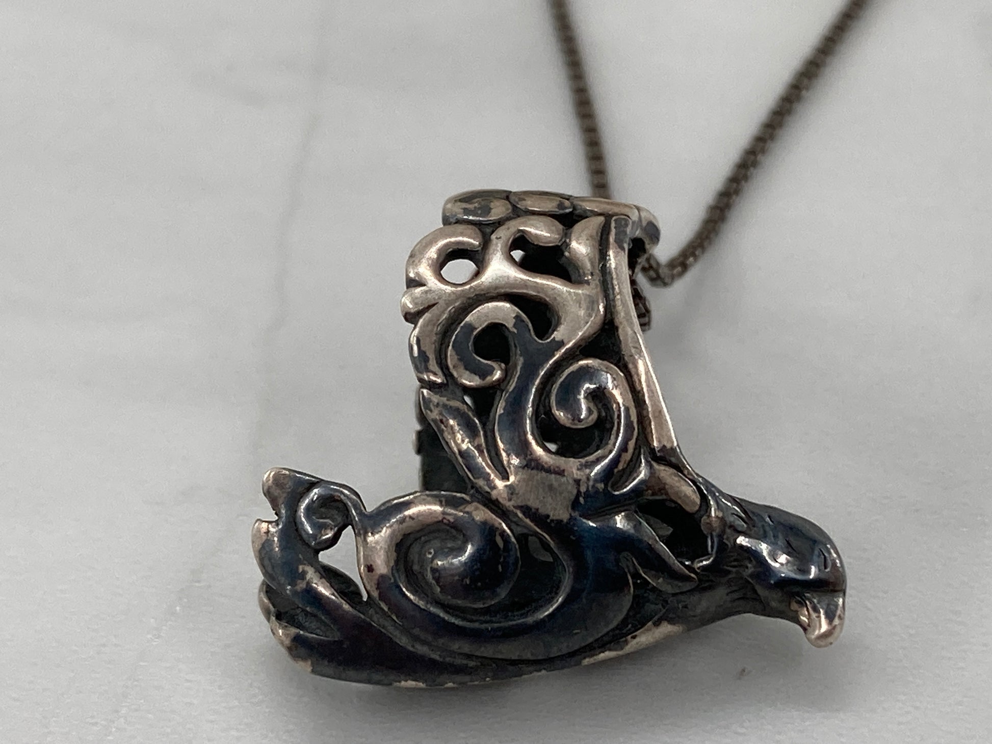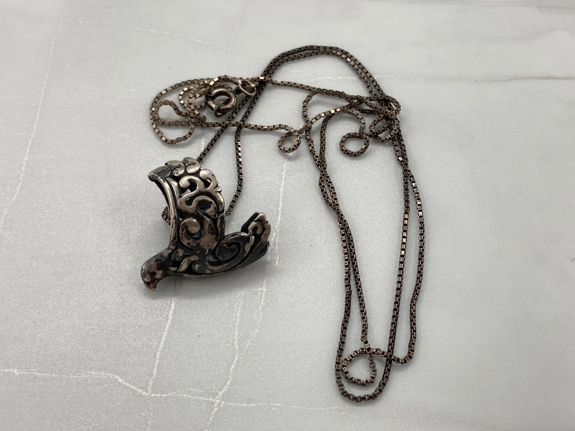 This Dove came to us as an earring with no mate. We decided to take off the earring part and close the wings. Then paired it with a 30 inch 1mm box chain.