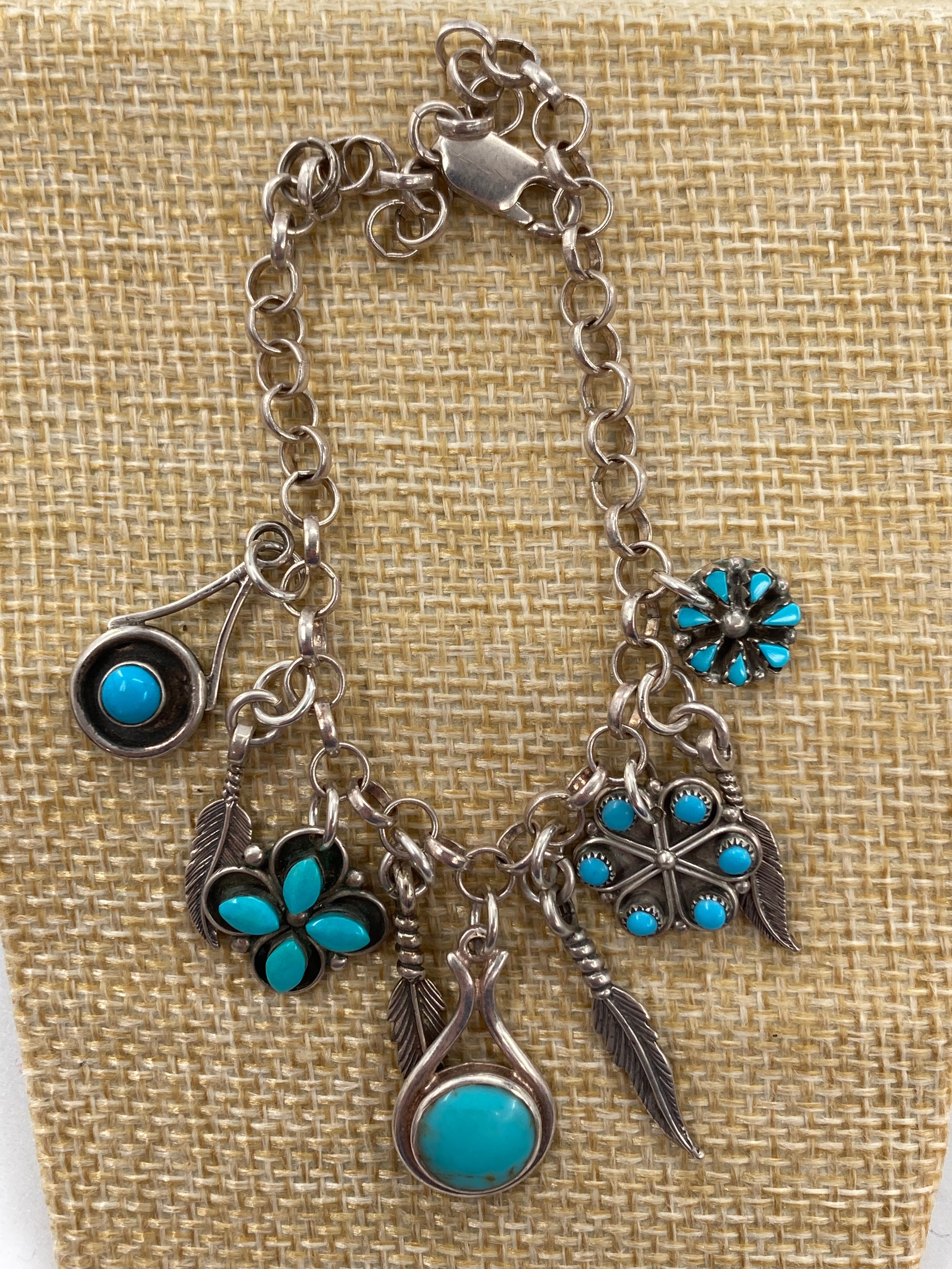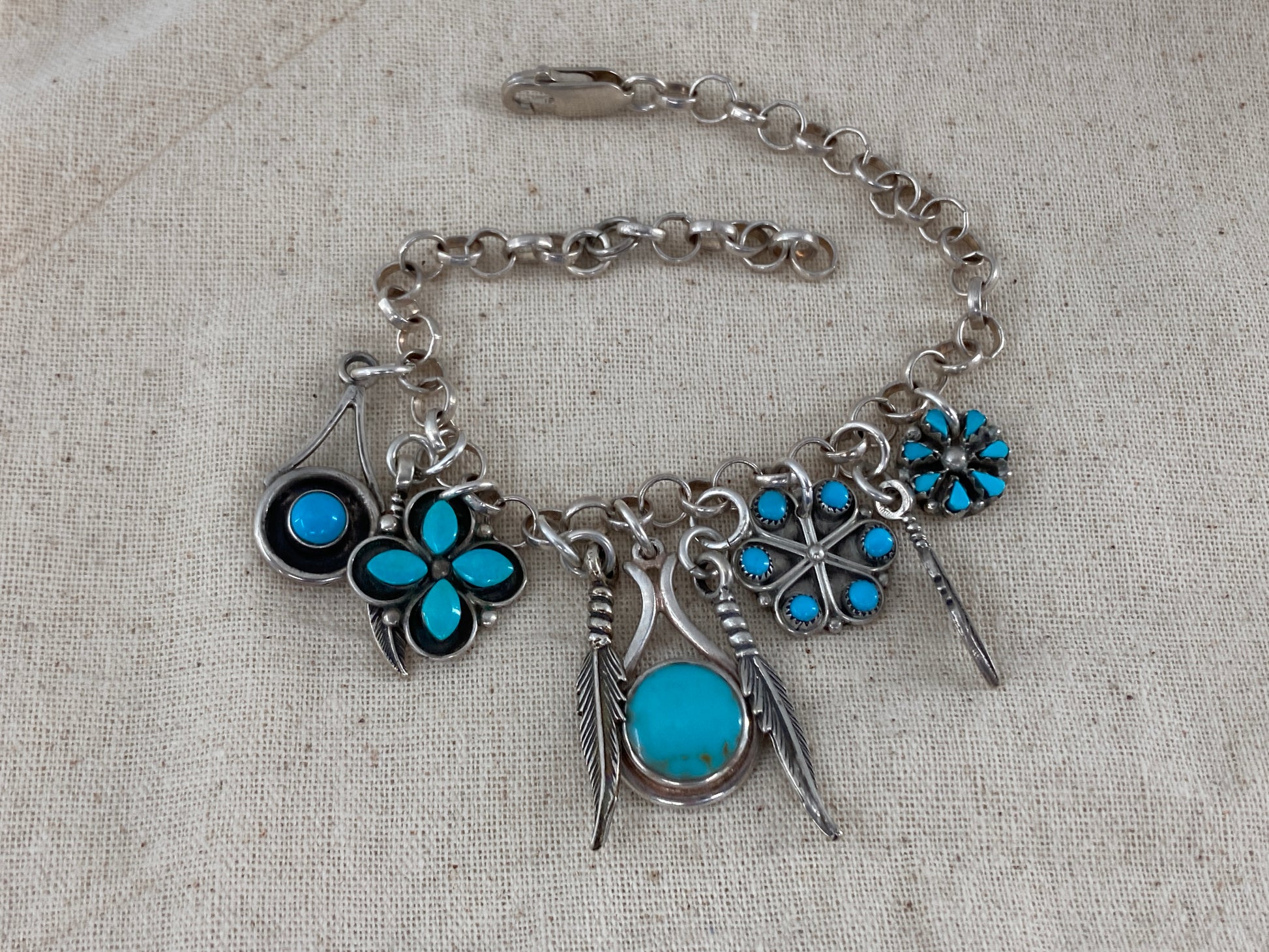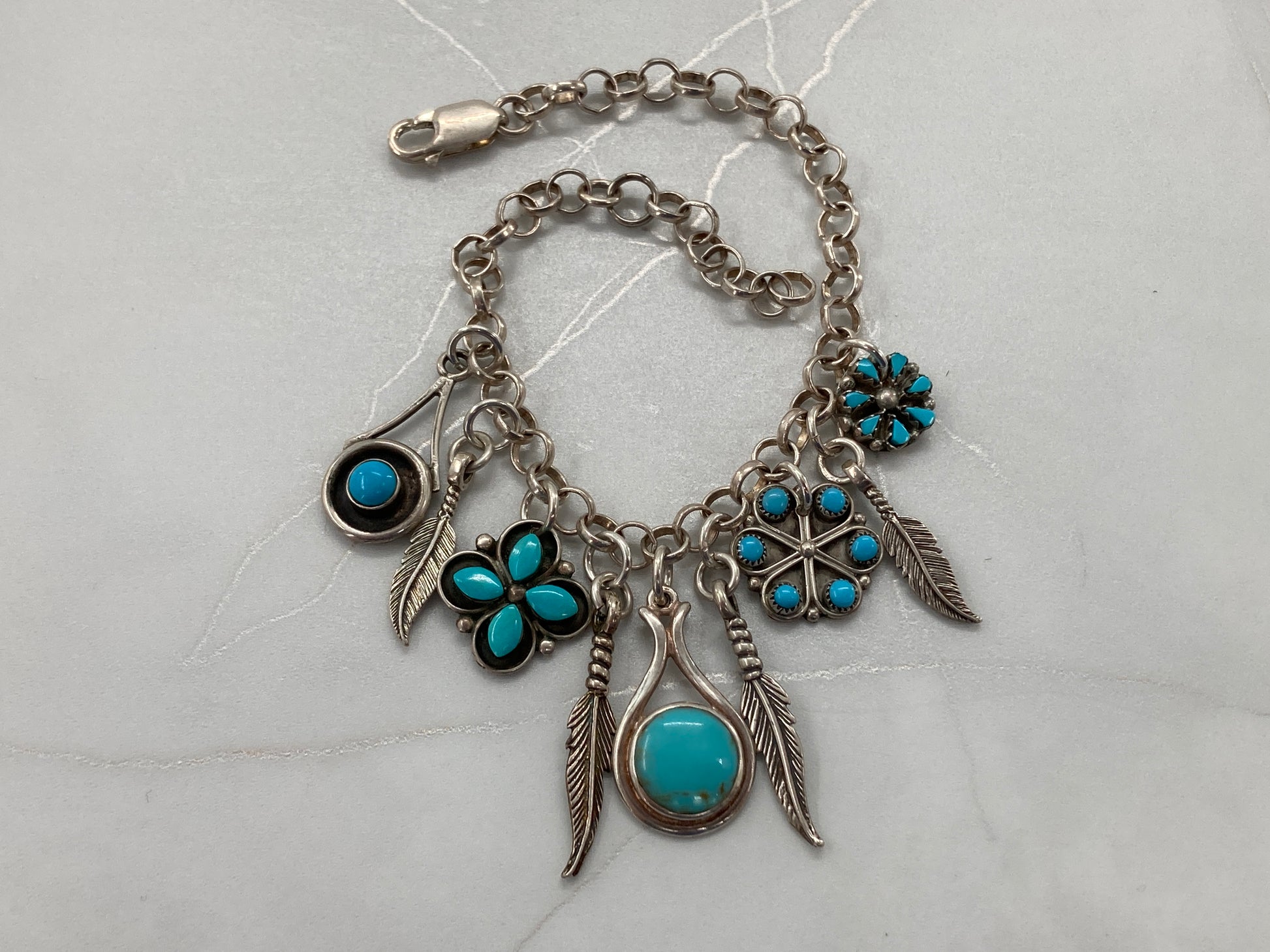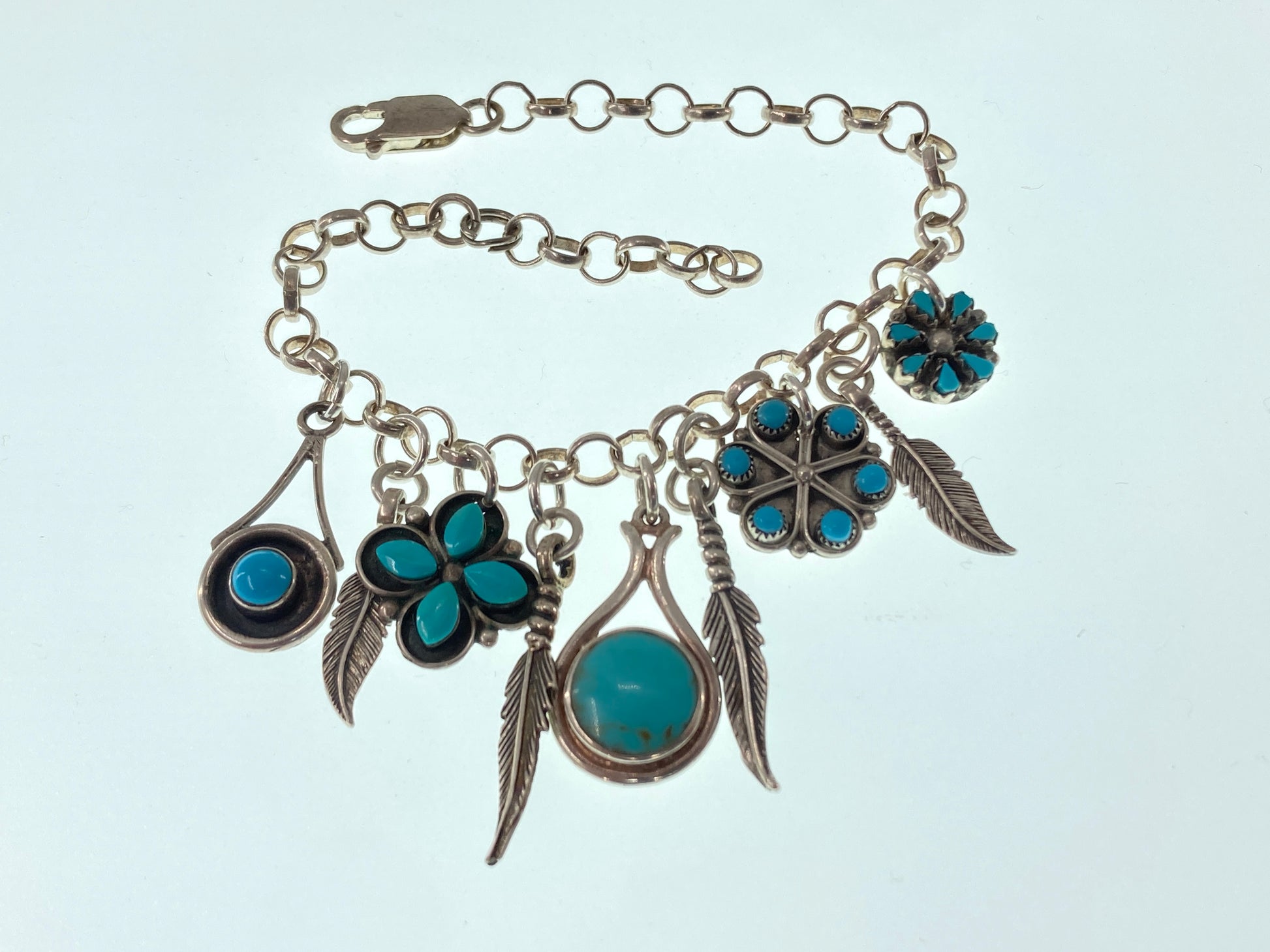 This impossible Turquoise charm bracelet is made of many different items.... an 8 inch sterling silver rolo style chain, one-off Turquoise earrings (Kingman Turquoise, Sleeping Beauty Turquoise, and Reconstituted Turquoise), as well as rescued sterling silver feather charms. Weighing in at 17 grams. What a stunning masterpiece!