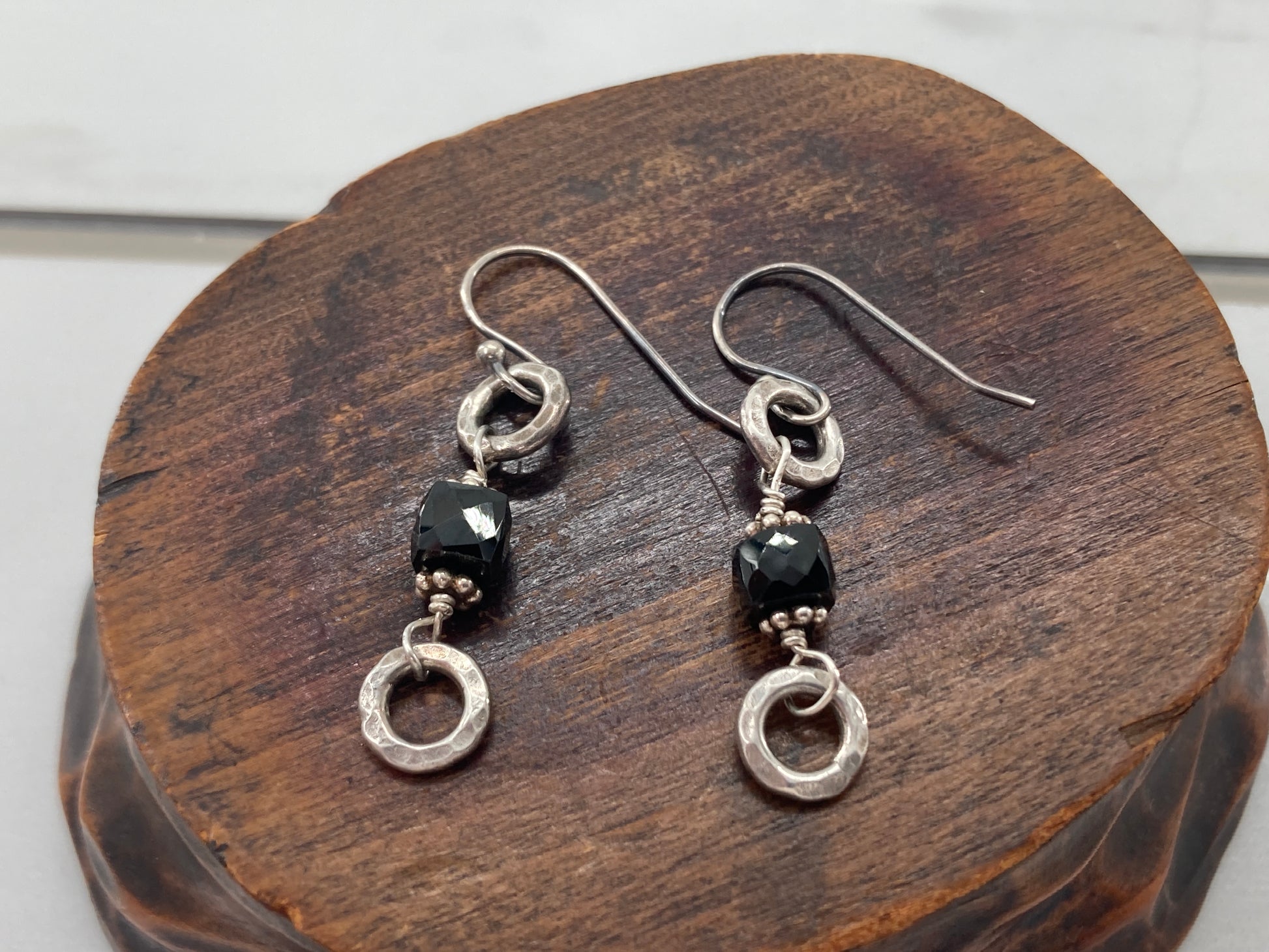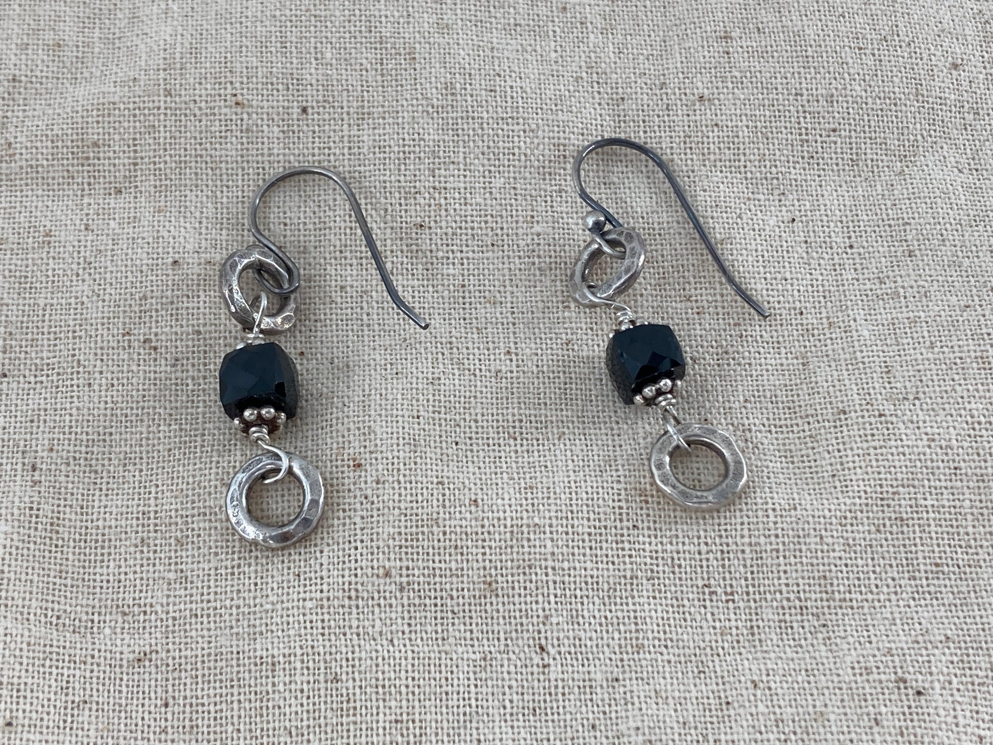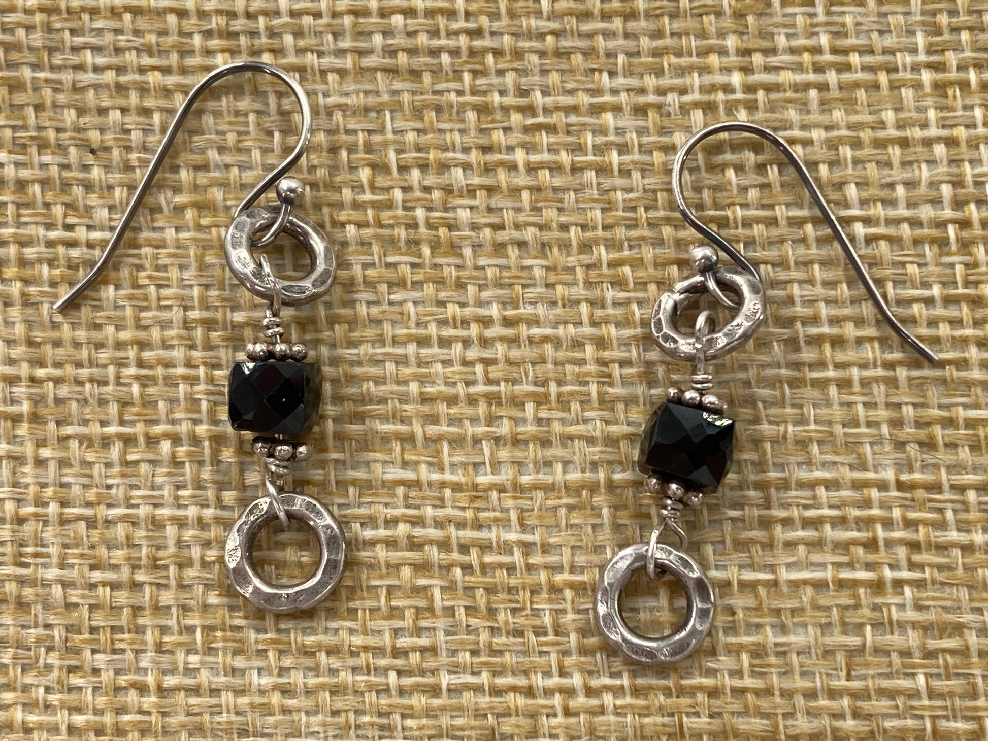 These Black Jet beads and Sterling Silver circles were originally part of a bracelet. Came to us broken beyond repair so we took it a part a bit further and made earrings out of it. Adding timeless French Hook ear wires they sway like no other. Only 2 pairs available!