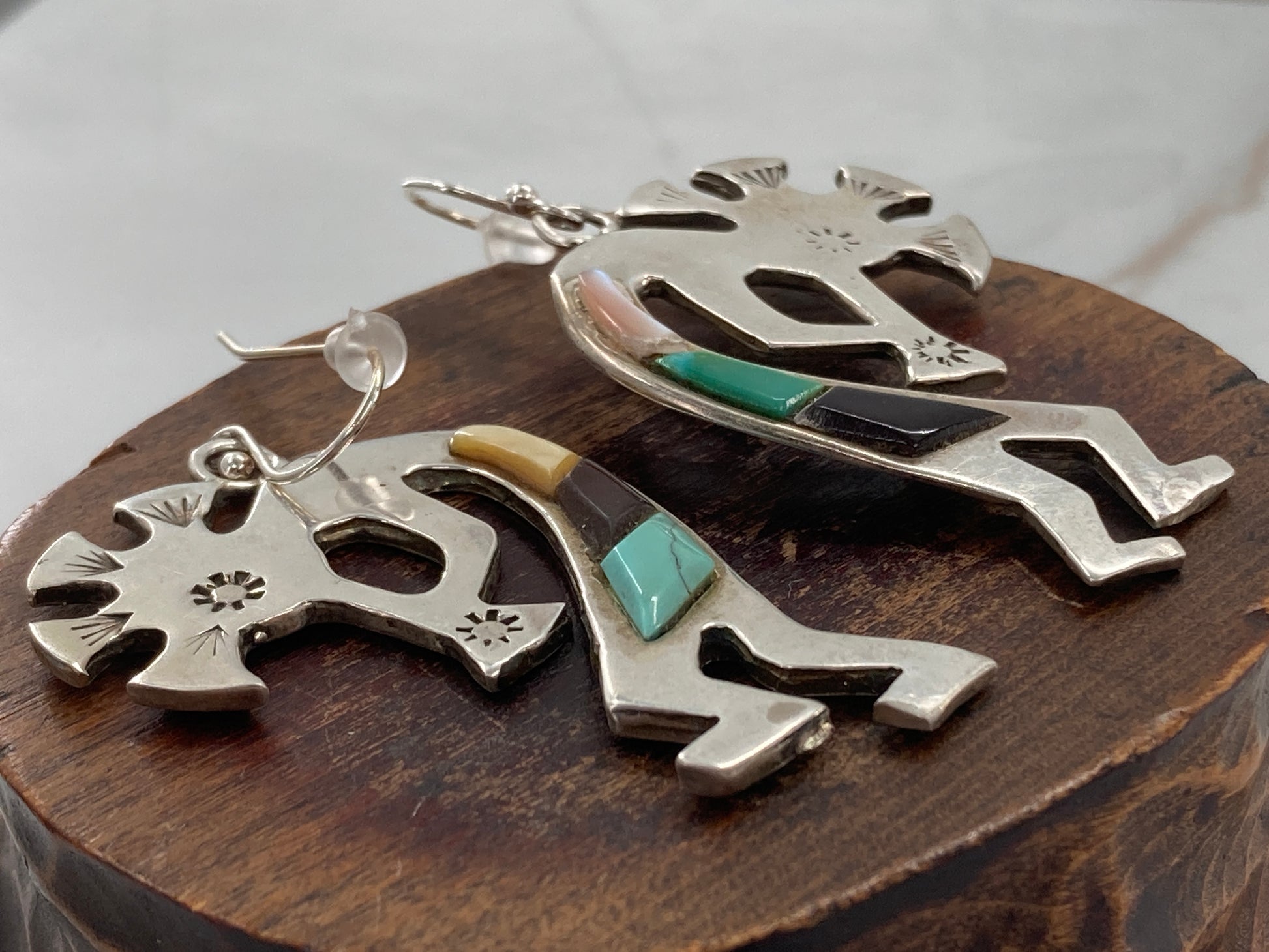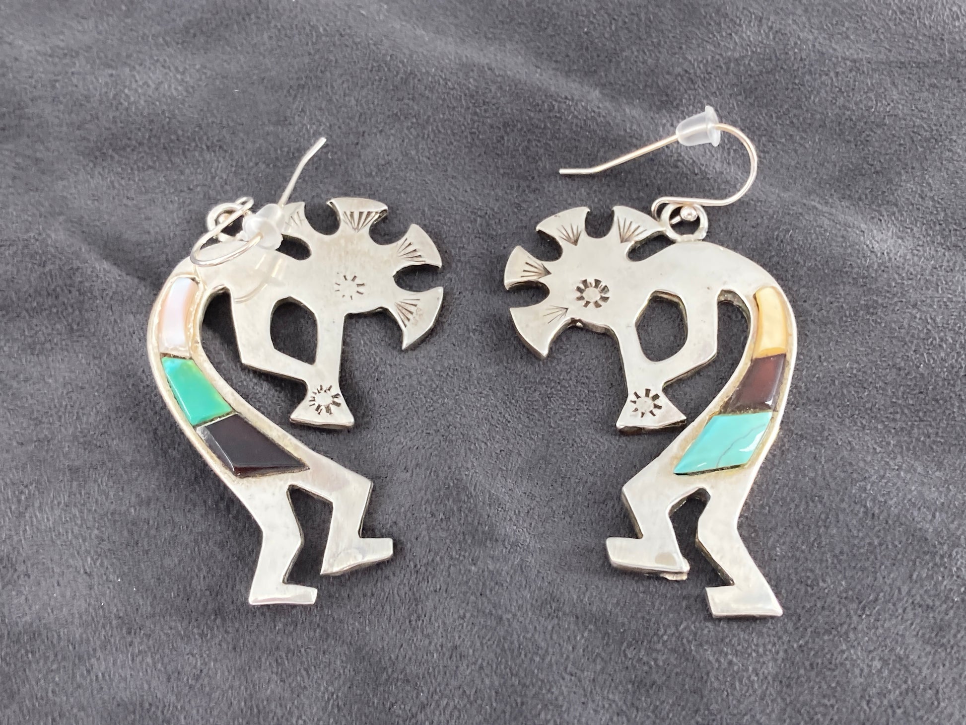 These earrings have a sister pair out there, both are Native American Kokopelli. This pair has Turquoise stones, Mother of Pearls, and Black Onyx inlayed in sterling silver. We added sterling silver French Hook ear wires for a classic touch.