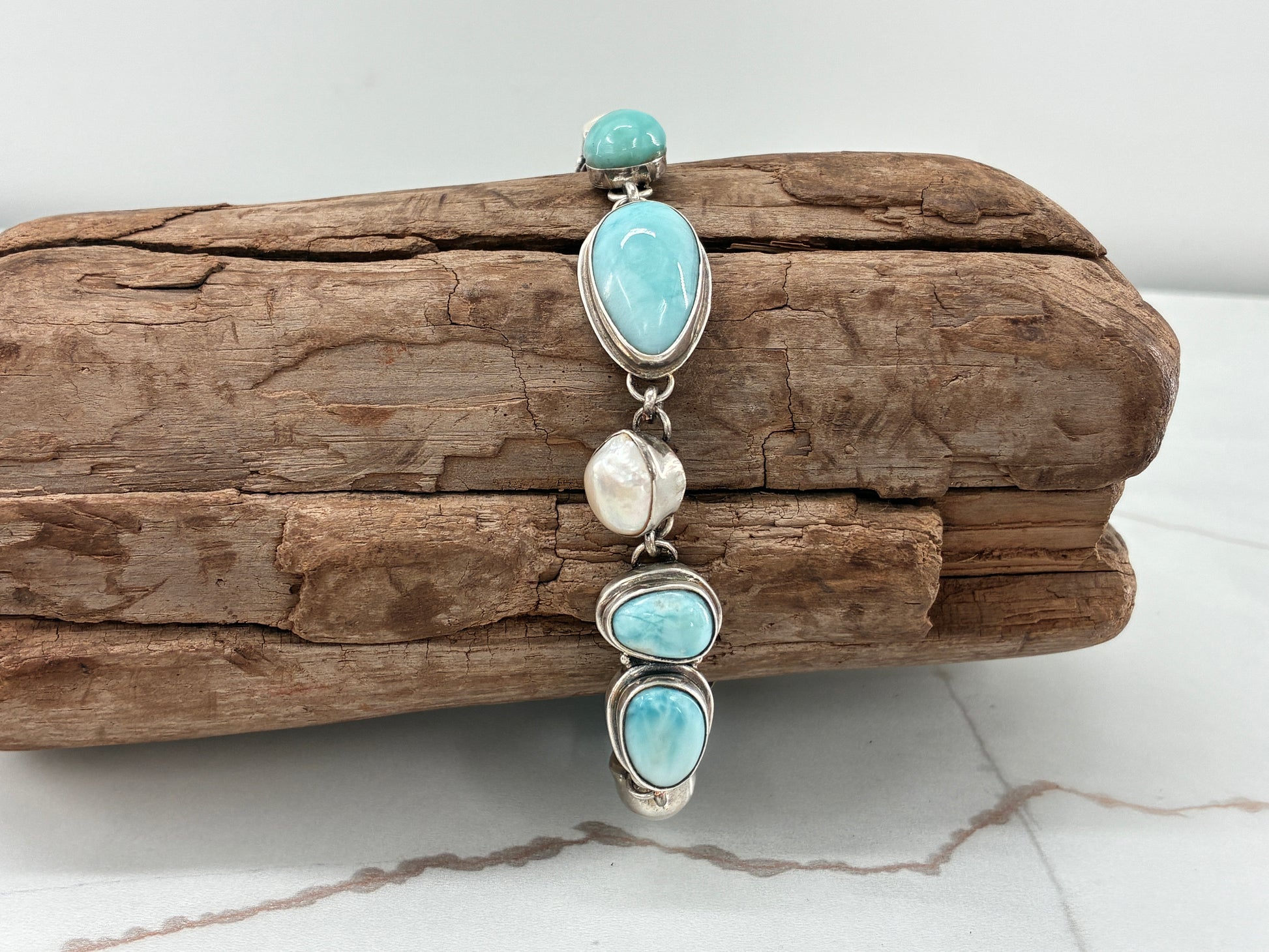 This Larimar and Pearl Impossible Bracelet is made possible by bringing together broken and widowed earrings that were otherwise meant for scrap. We thought the Larimar stones paired well with the Pearls, don't you?