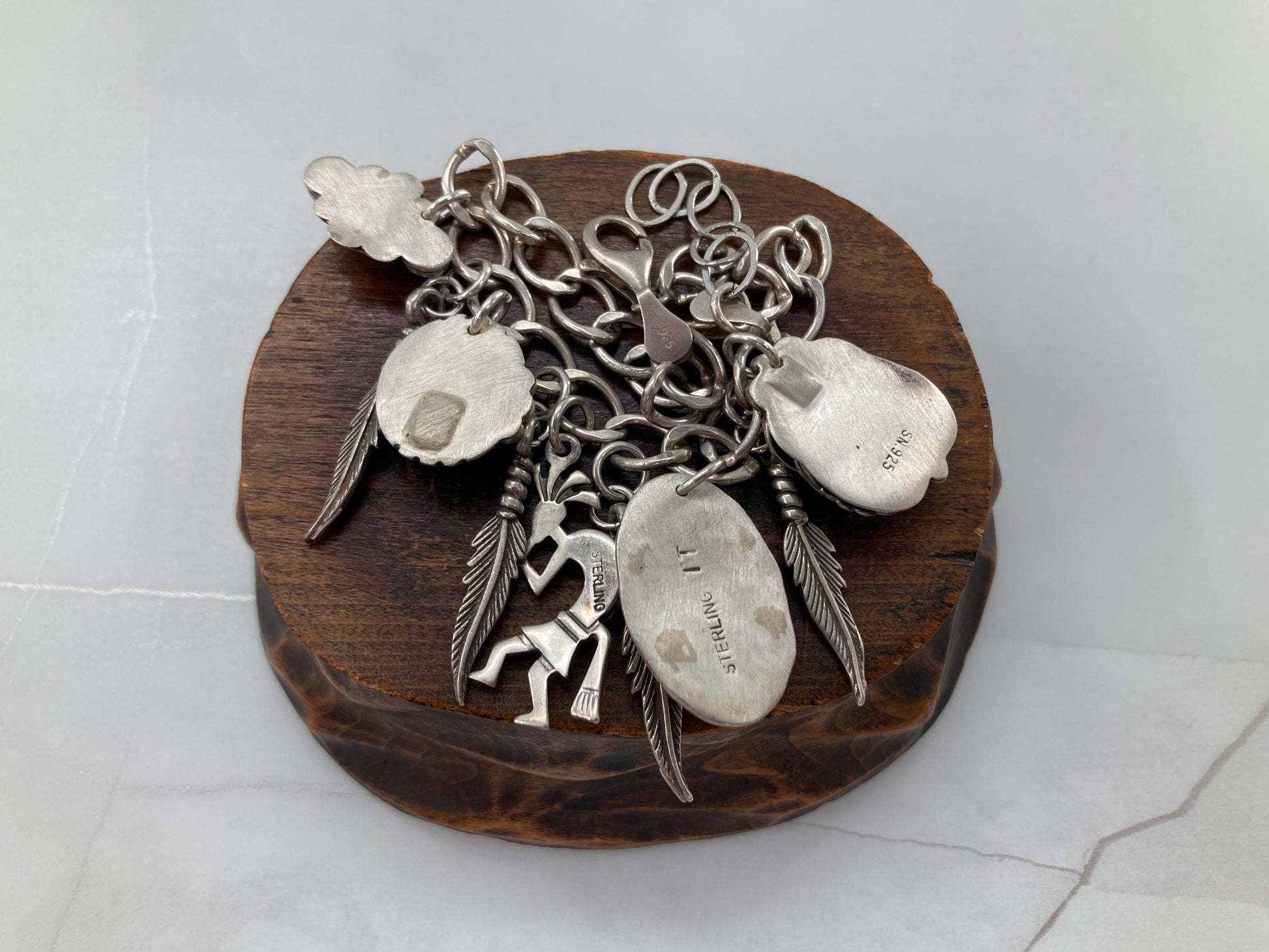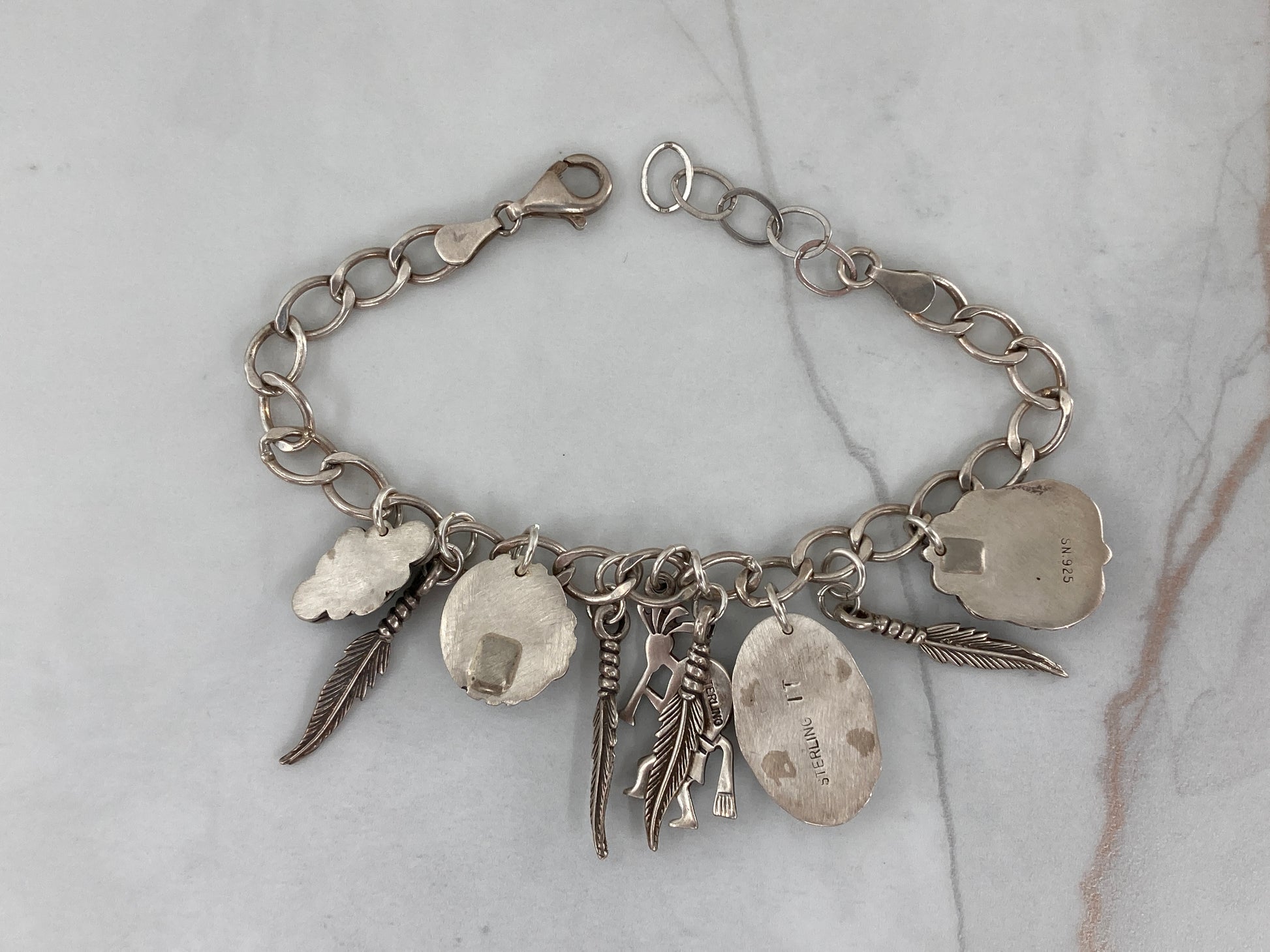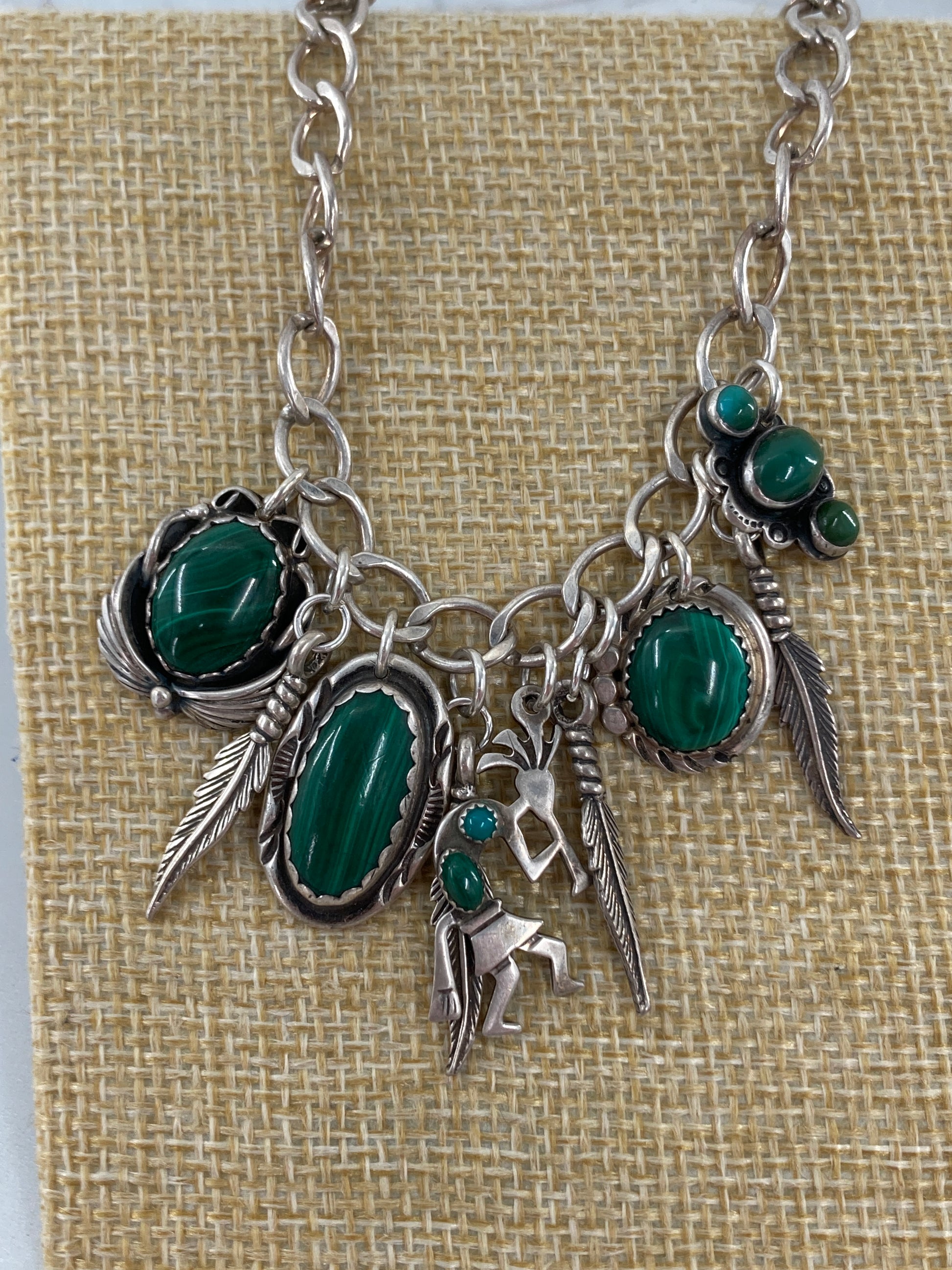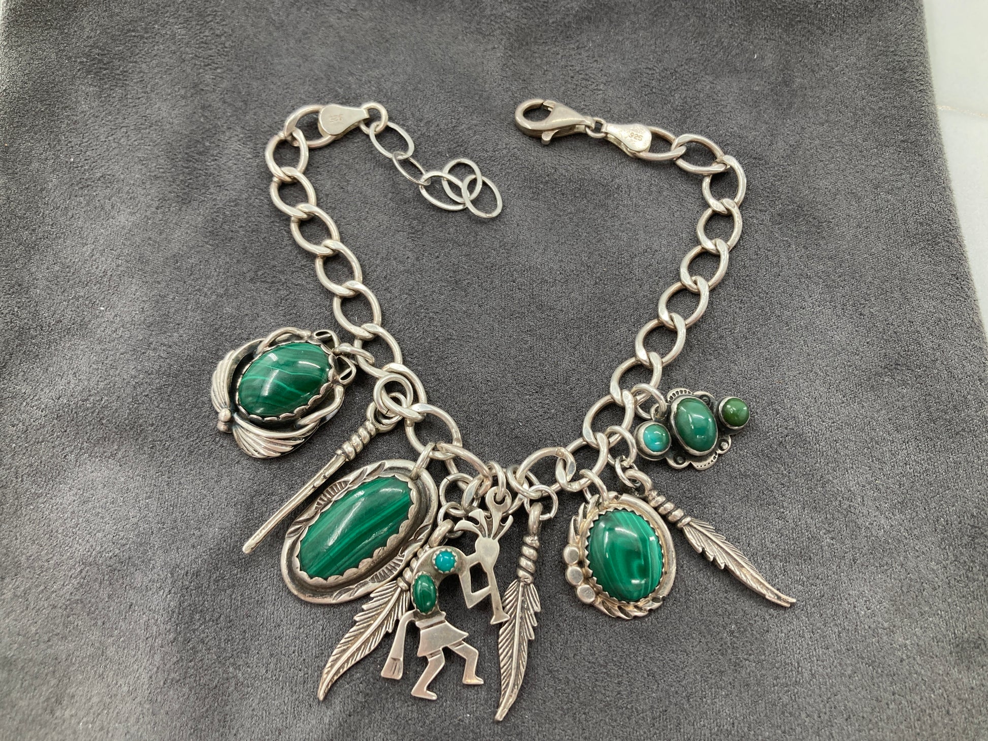 This Malachite Charm Bracelet is made of a 7.5 inch Sterling Silver Curb Chain bracelet with rescued single Malachite stone earrings and feathers from a retired Artists collection. Complemented with the timeless lobster claw clasp. This bracelet weighs in at 27 grams.