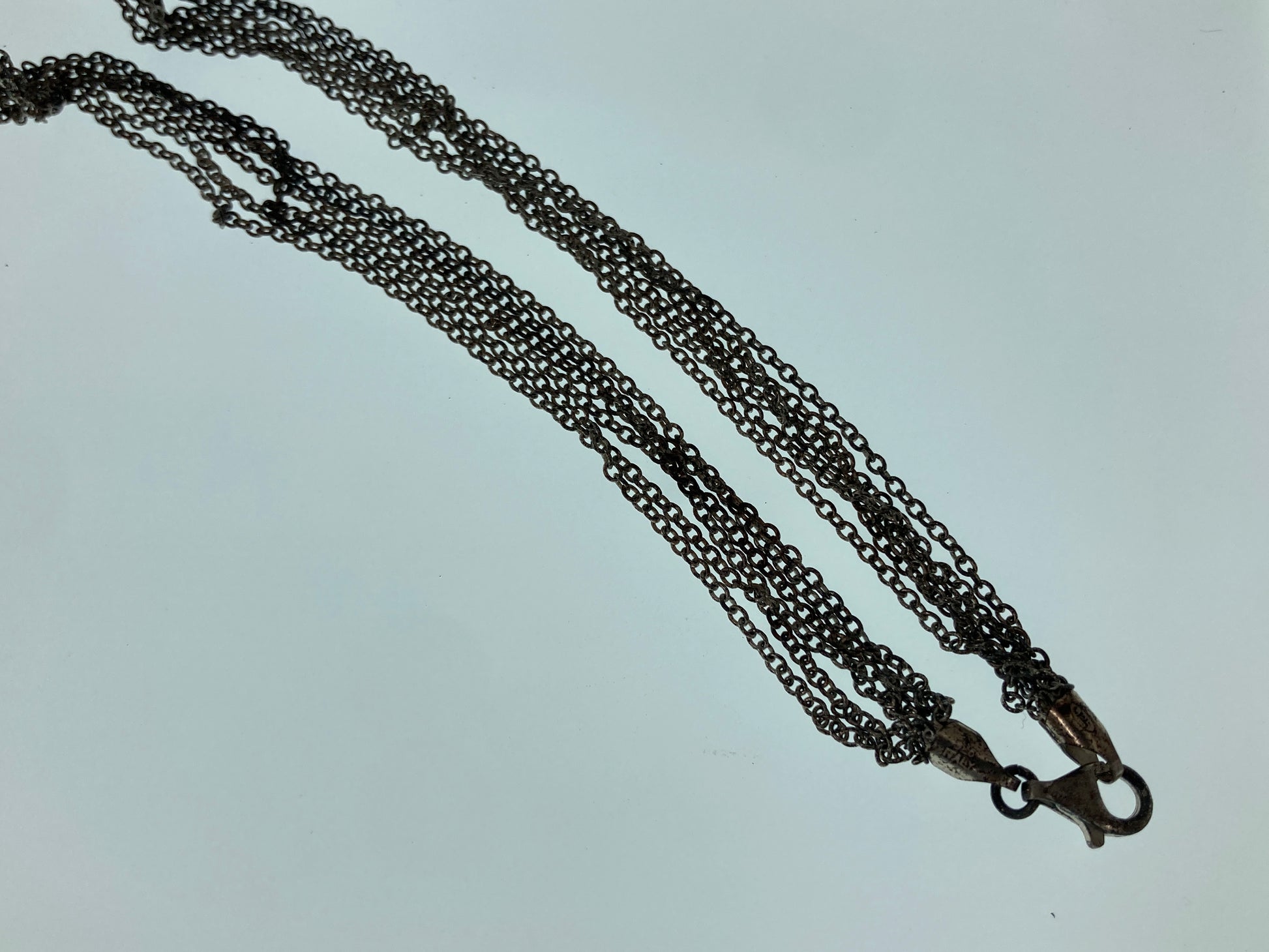 The center of this necklace was a broken bolo tie, Artisan made and signed HARR. The stone is a Morenci Turquoise. We cleaned it up and added a 16 inch Italian multi-strand sterling silver chain. This necklace weighs in at 60 grams.