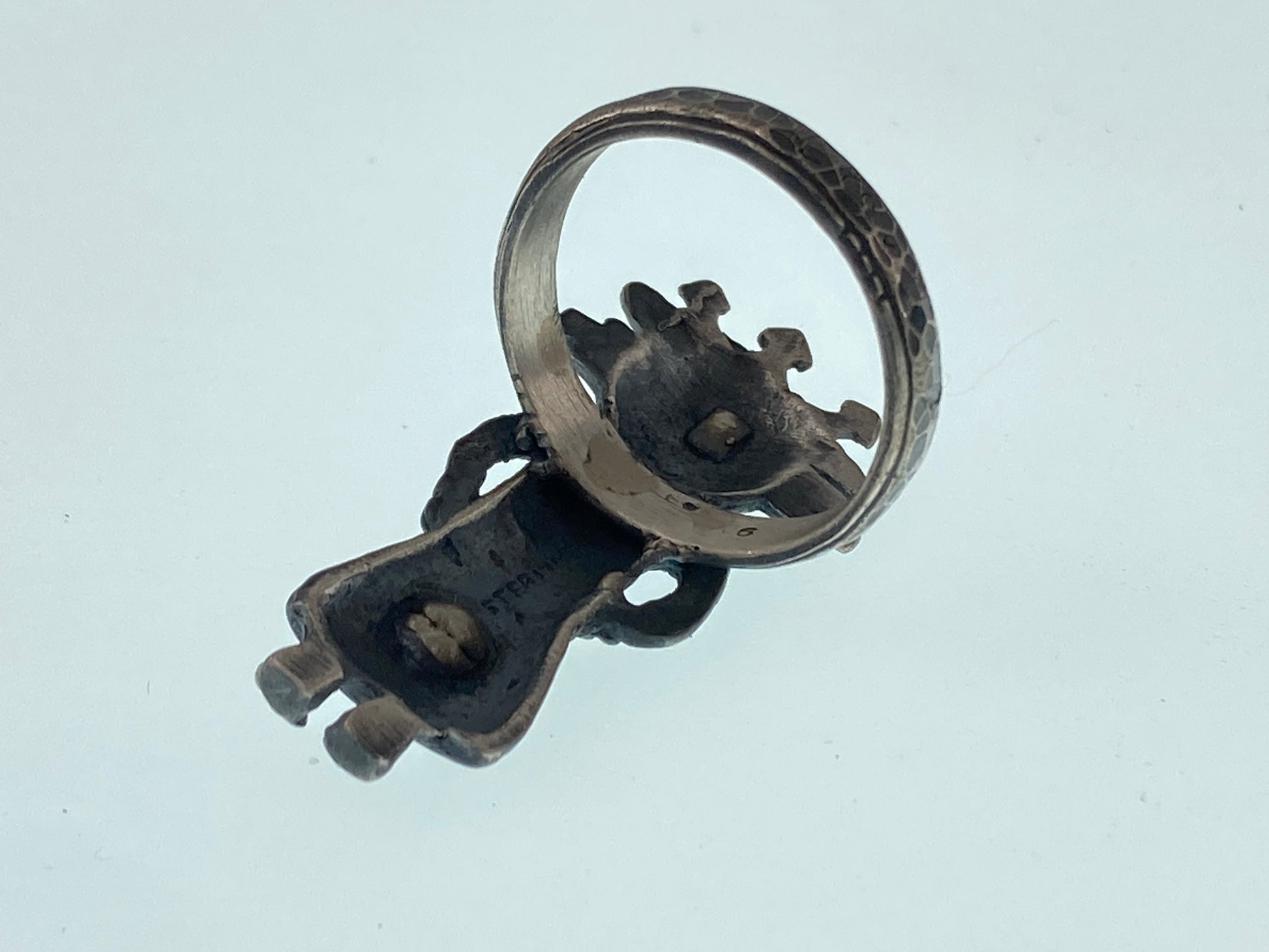 A rescued broken Native American Kachina Doll broach and a discarded ring shank pull together to make this unique sterling silver ring.