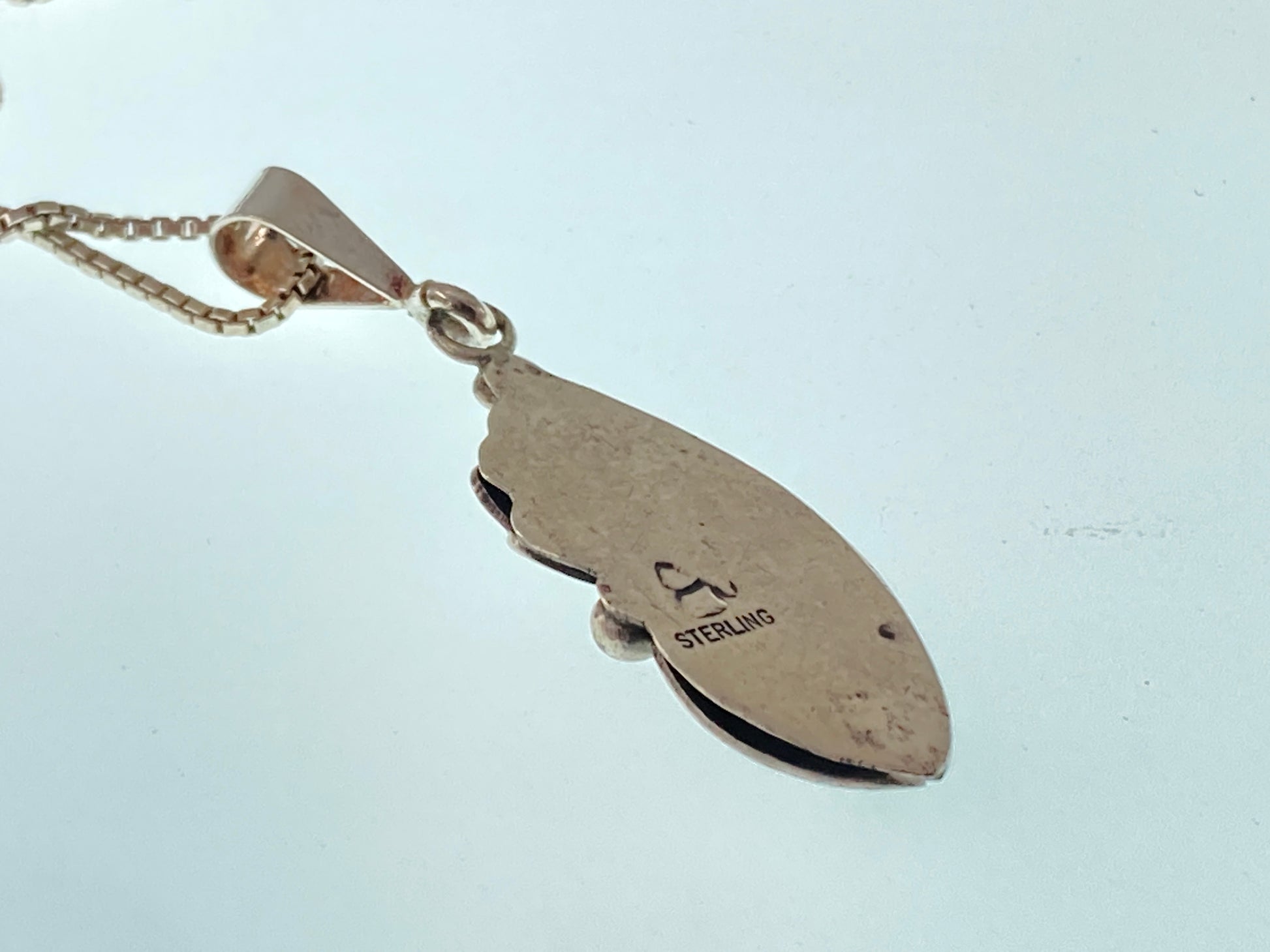 This necklace was a single lonely Navajo pattern leaf work earring. We cleaned it up and added a new bail, then hung it on a rescued 1.1mm 15 inch sterling silver box chain. What stunning artistry marked only by an 'A' on the back. We hope we've done it justice for new life.