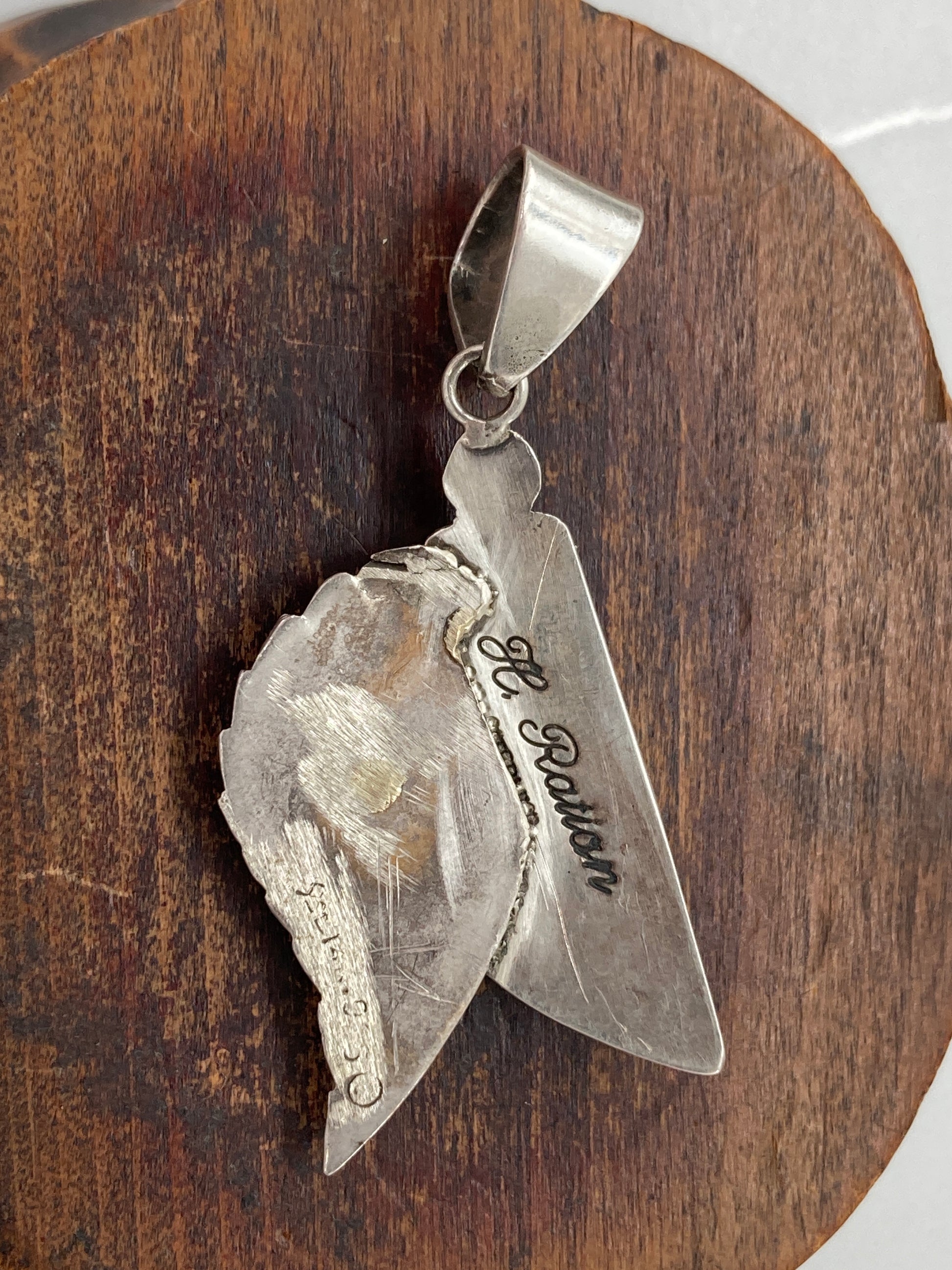 Native H. Ration single Patagonia Arizona Turquoise earring, a single feather post earring, and a Taxco bail make up this Rescued and Reborn Patagonia Arizona Turquoise Pendant.