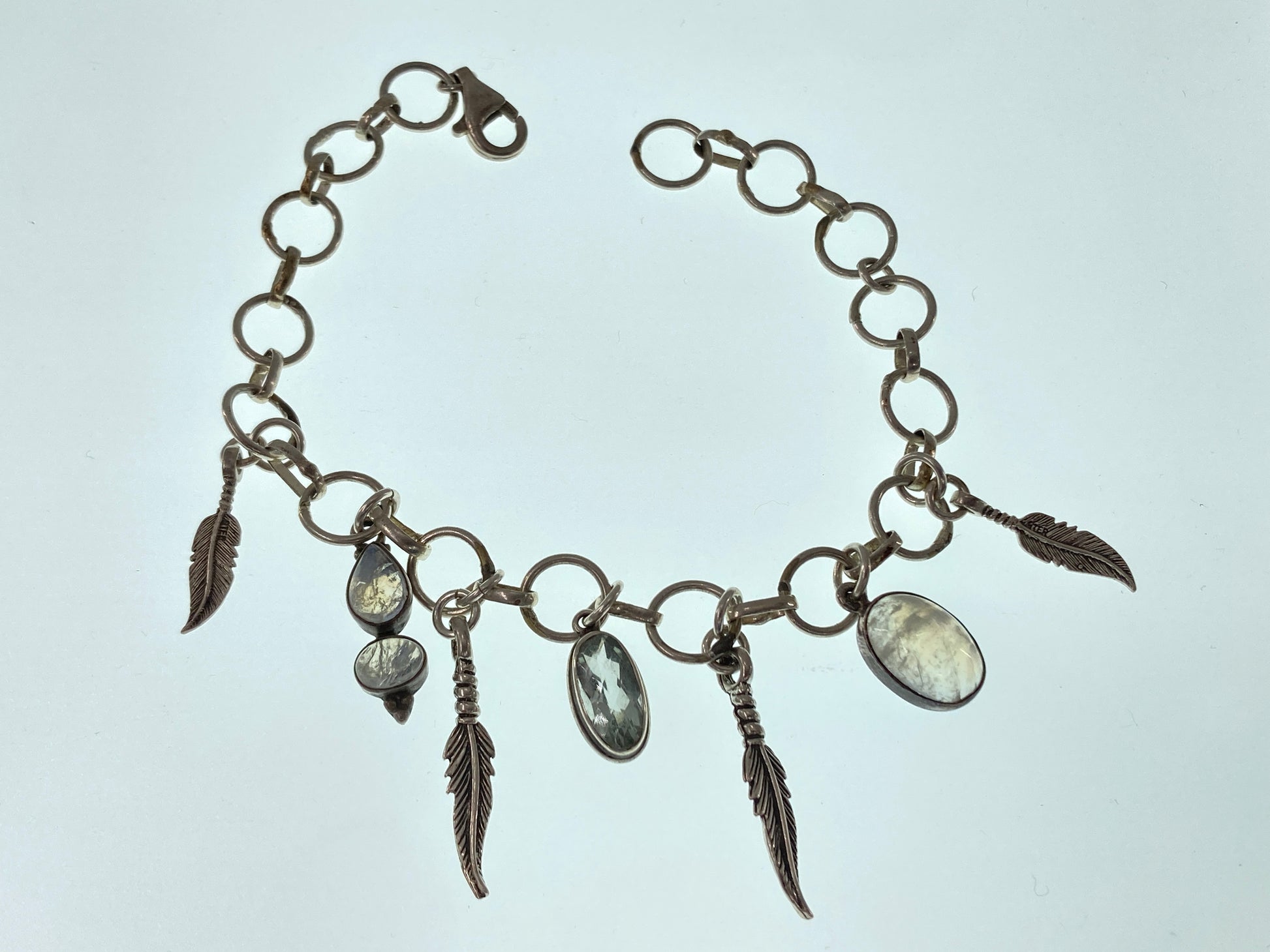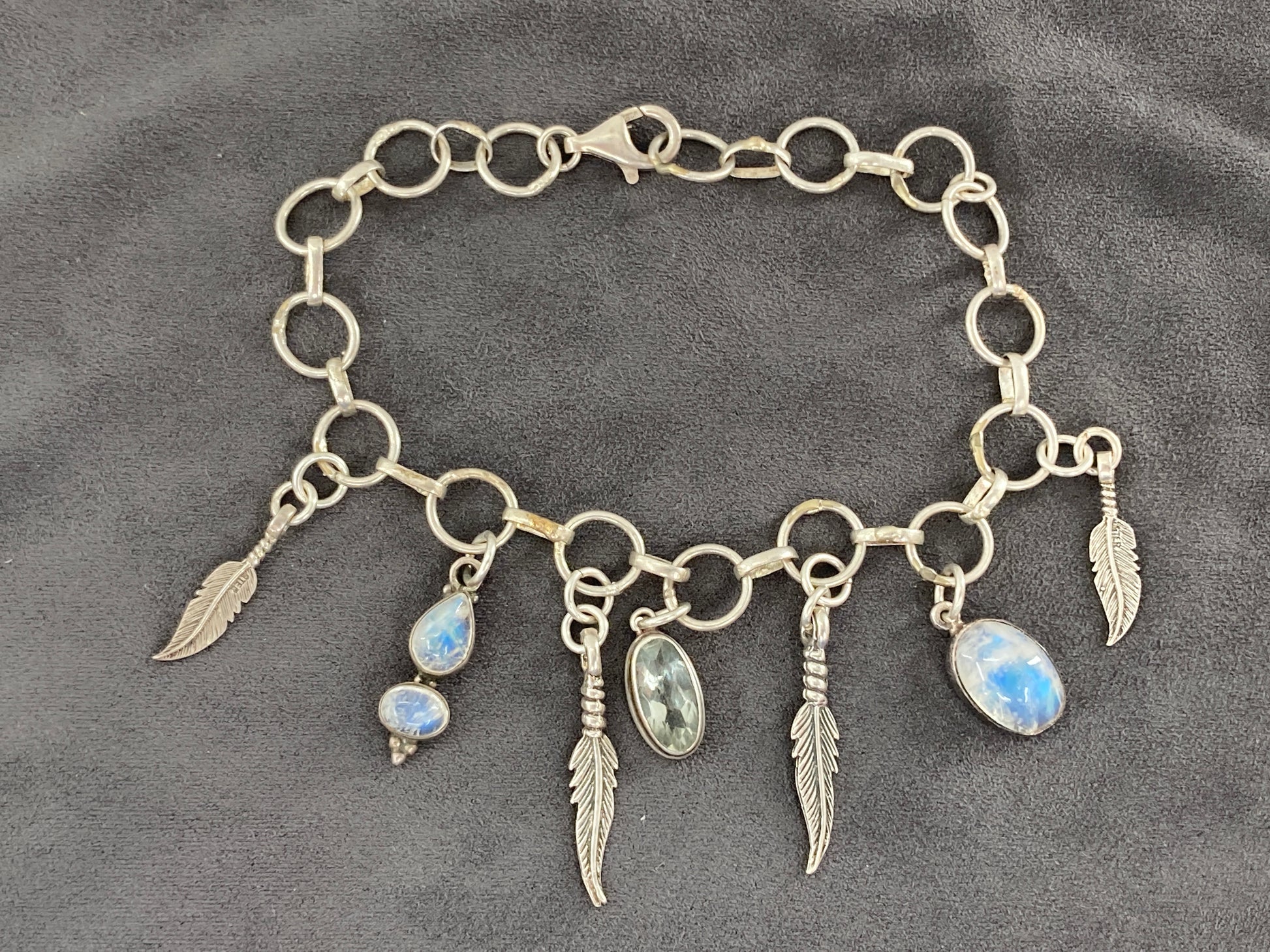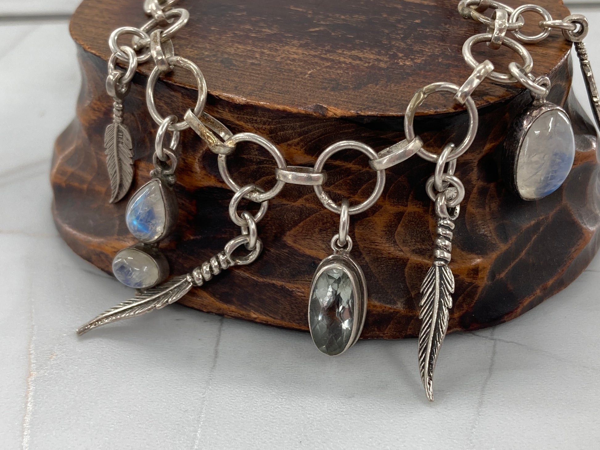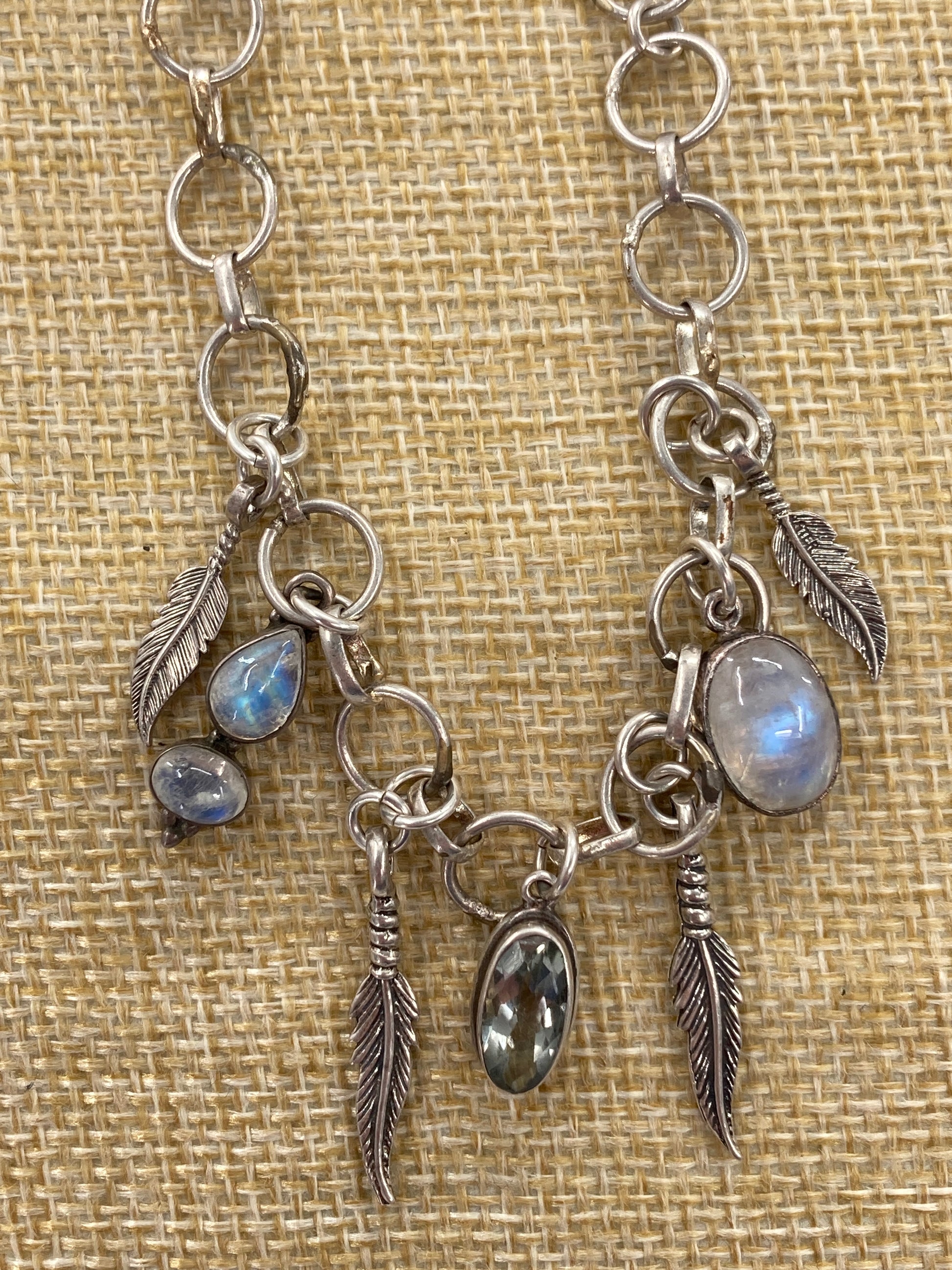 These Prasiolite and Rainbow Moonstone charms came to us as single earrings. The feathers were in a now retired Artists collection. All dangling on a unique rescued sterling silver chain cut to 8.5 inches.
