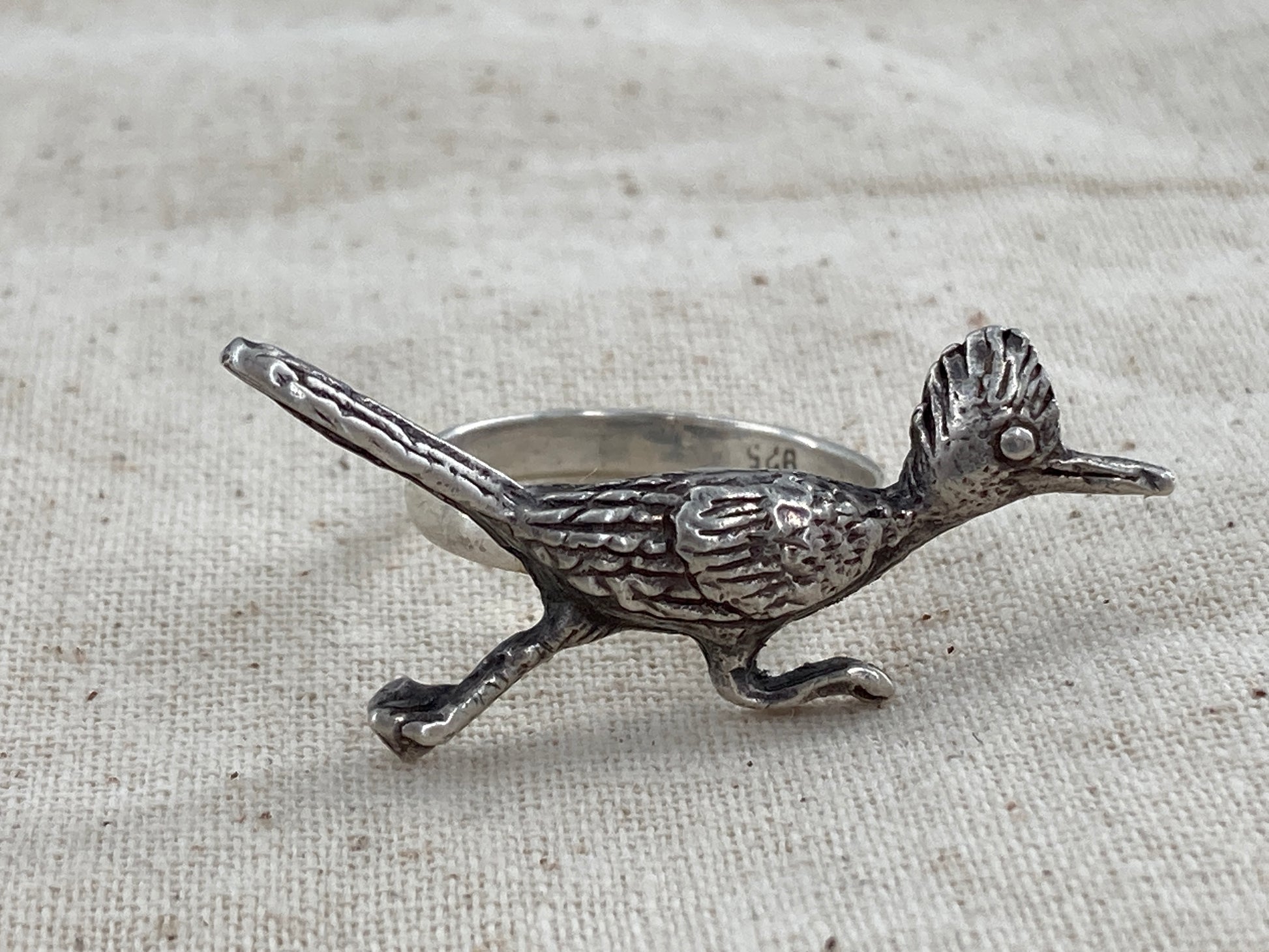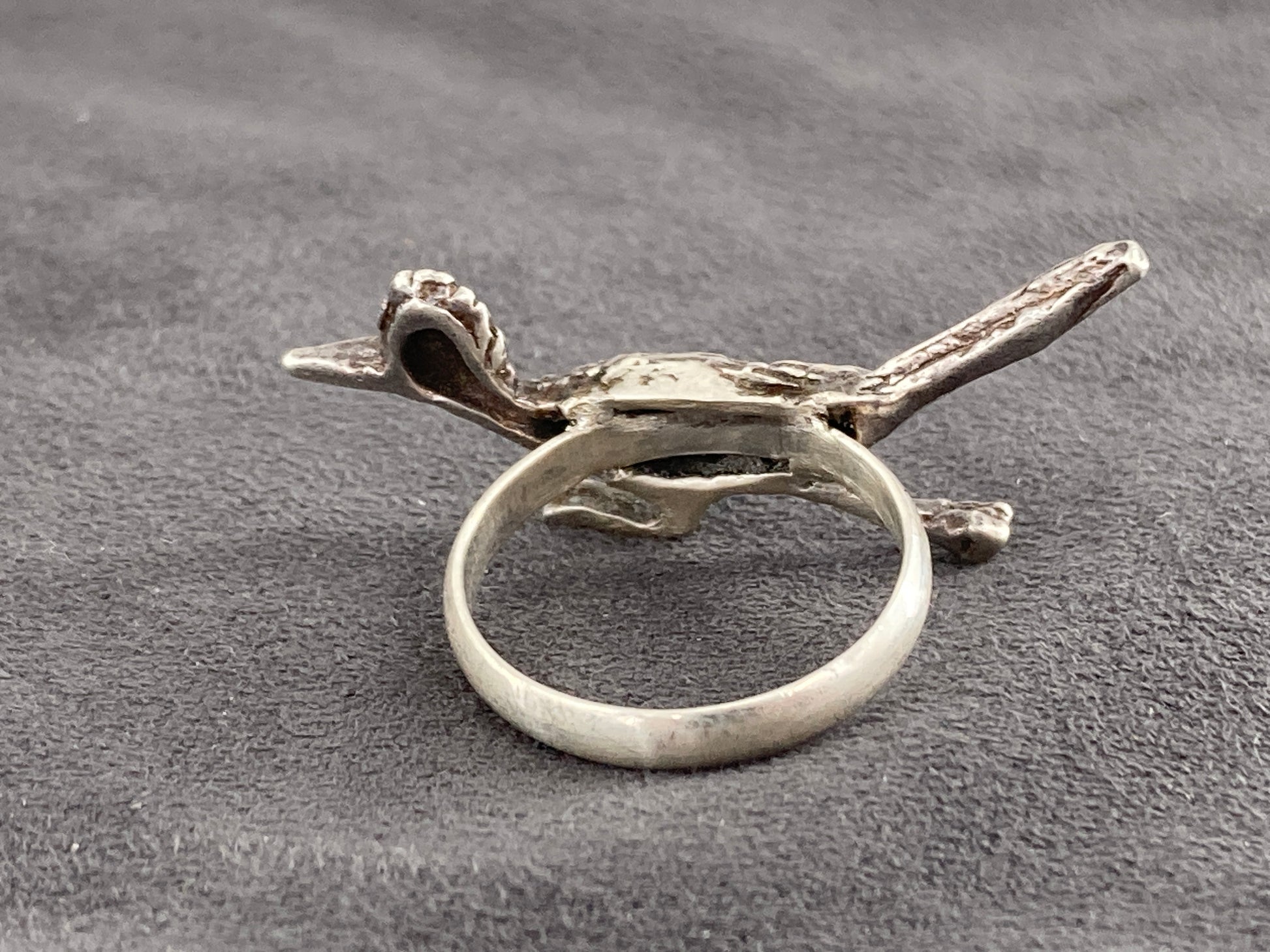 This sterling silver road runner was a broach that came to us broken beyond repair. We decided to give it new life as a ring so we paired it with a rescued sterling silver ring shank.