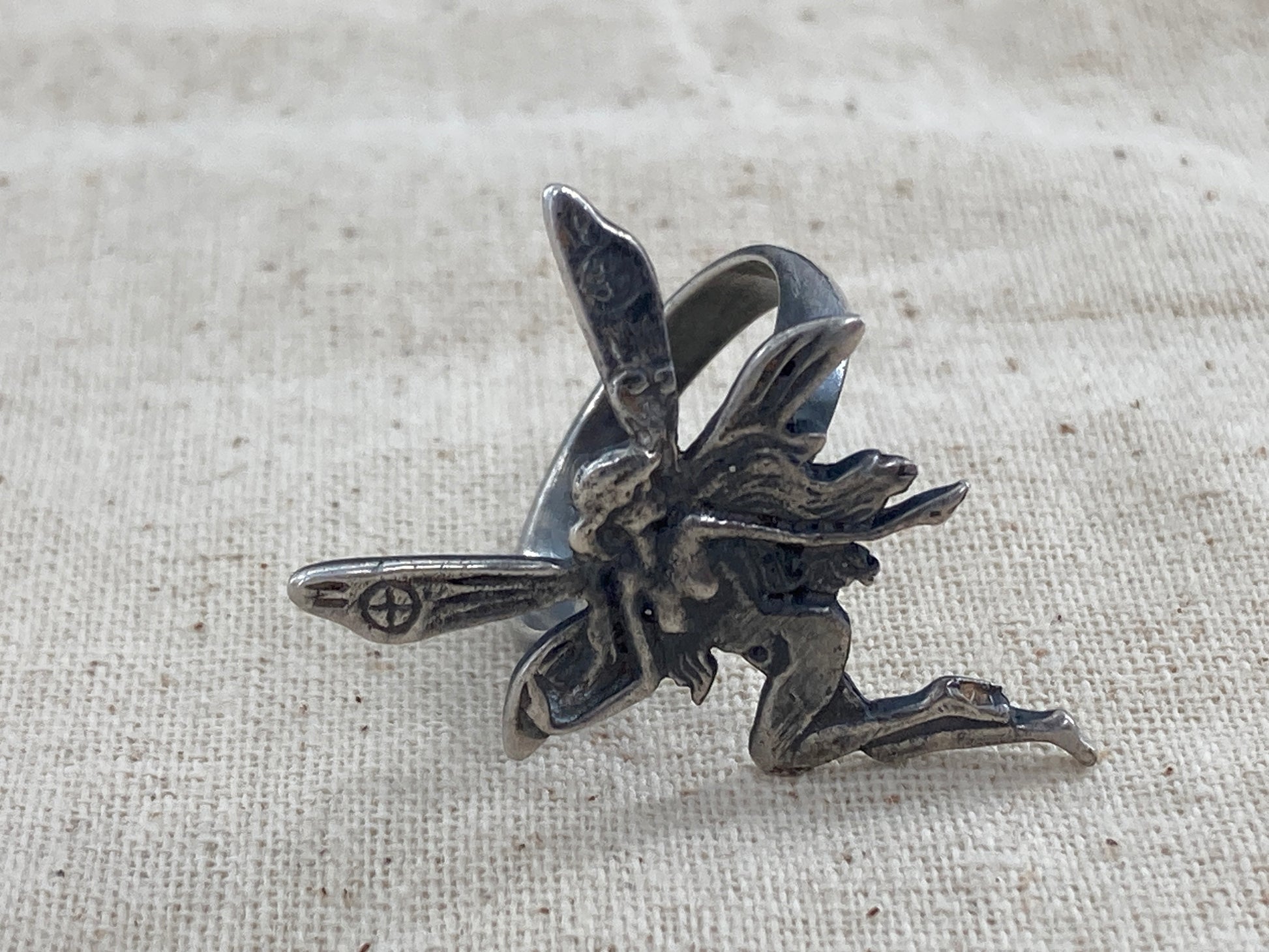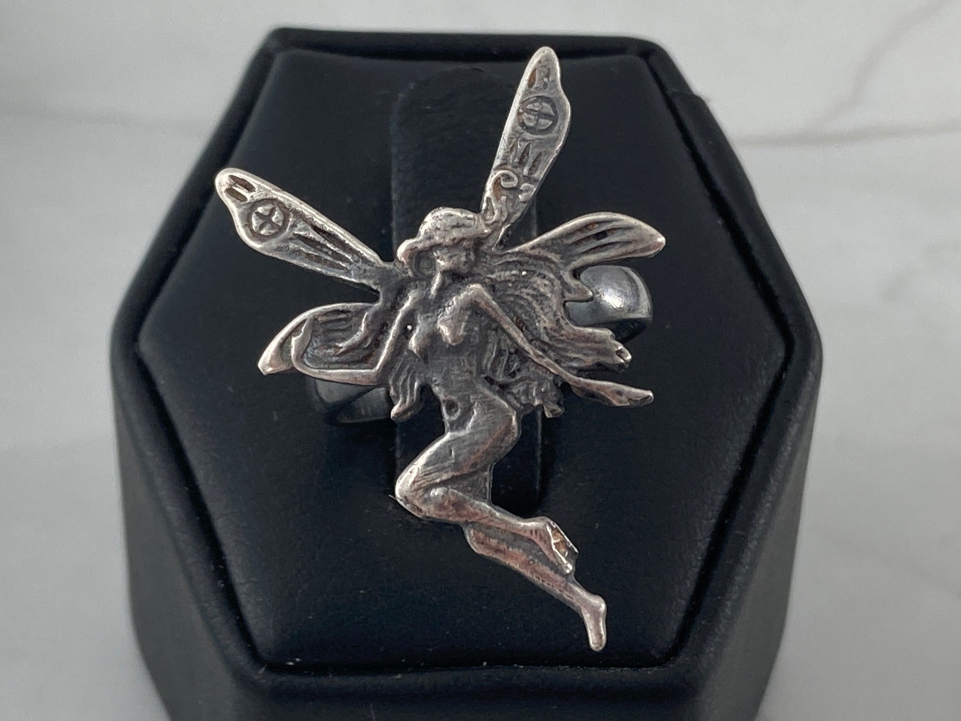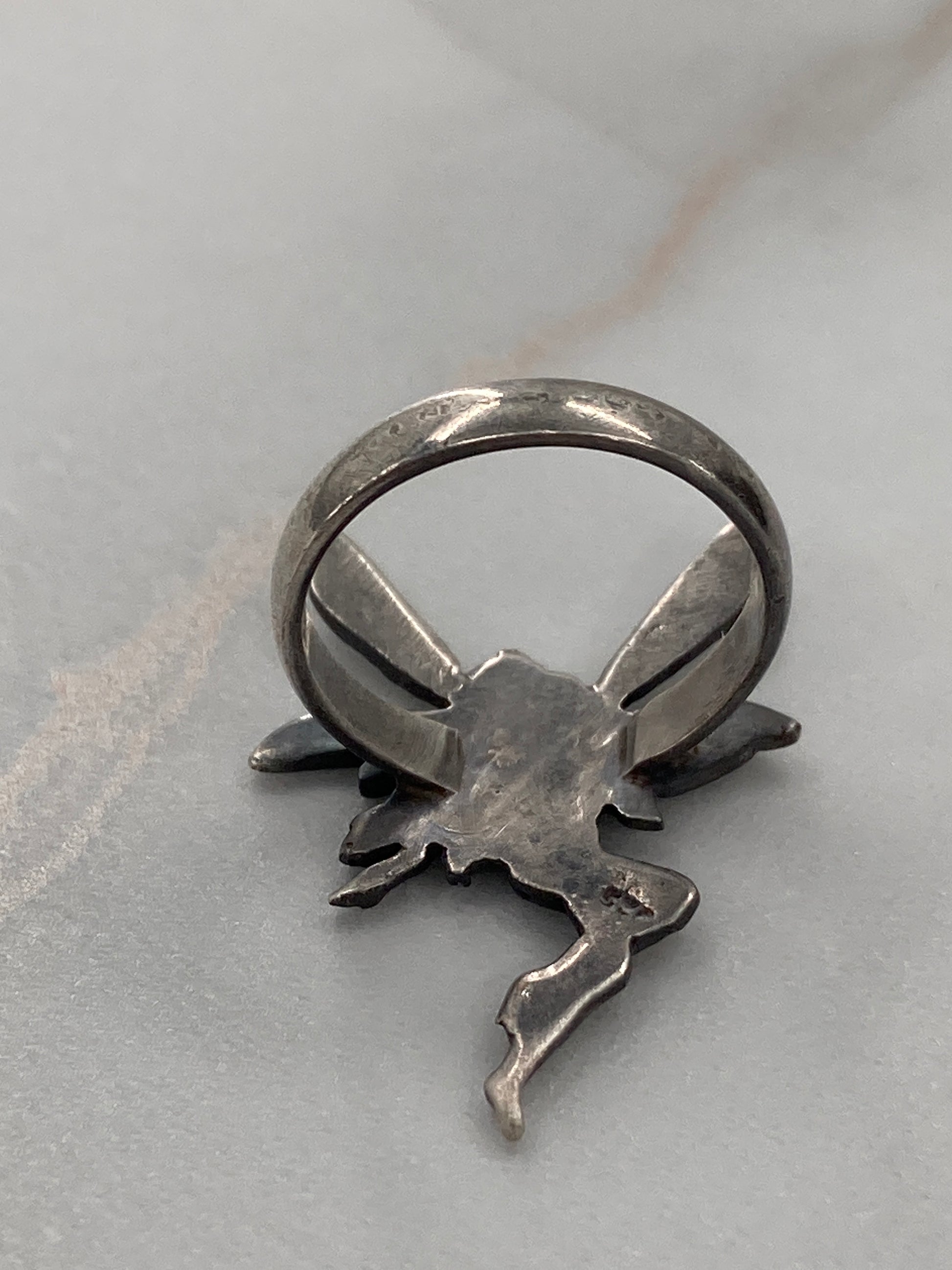This Fairy was rescued from an Artists recycle pile meant for melting down. We decided she would serve better as a ring so we paired her up with a ring shank that came to us as a broken ring. New life for this pair!