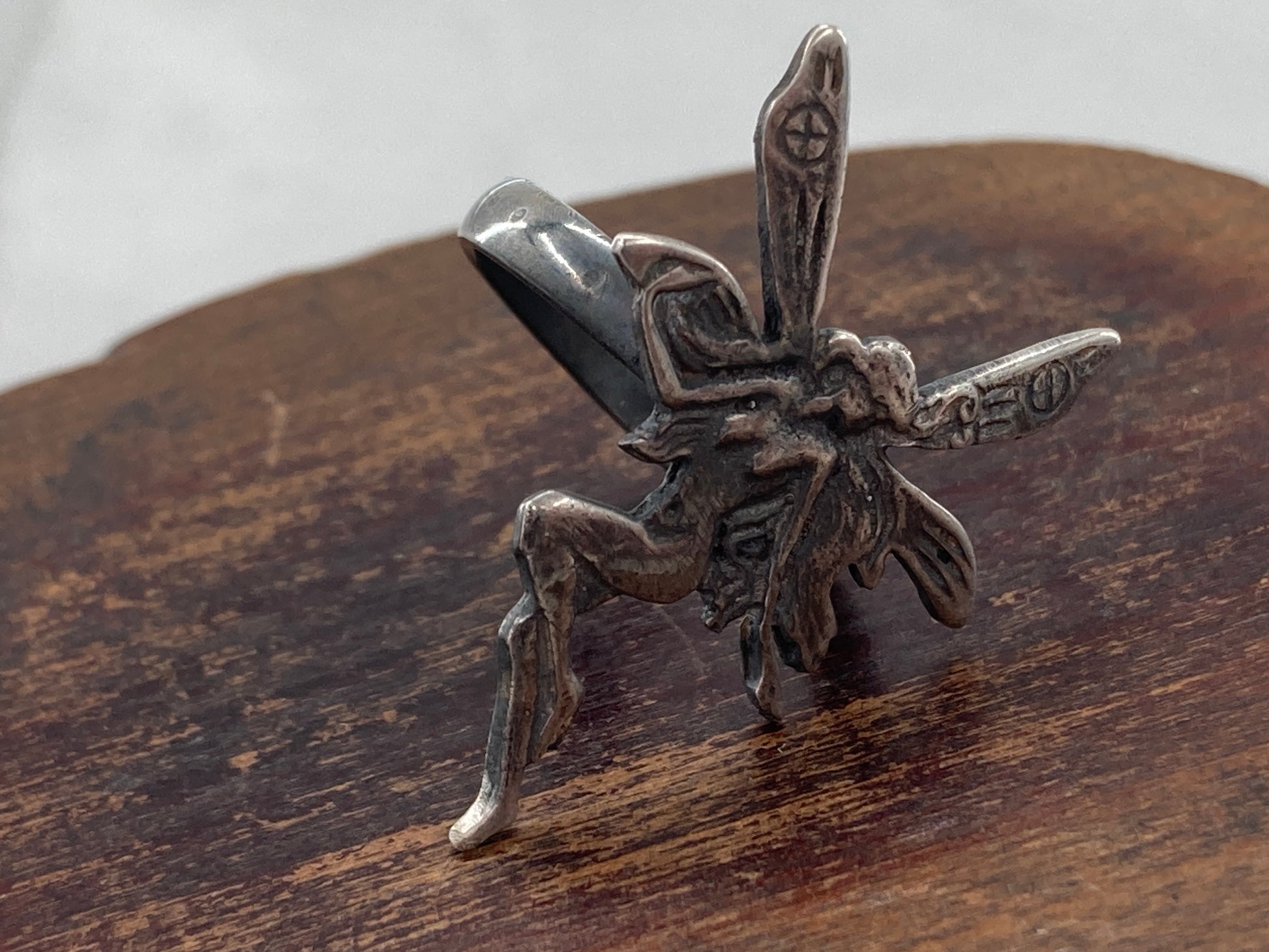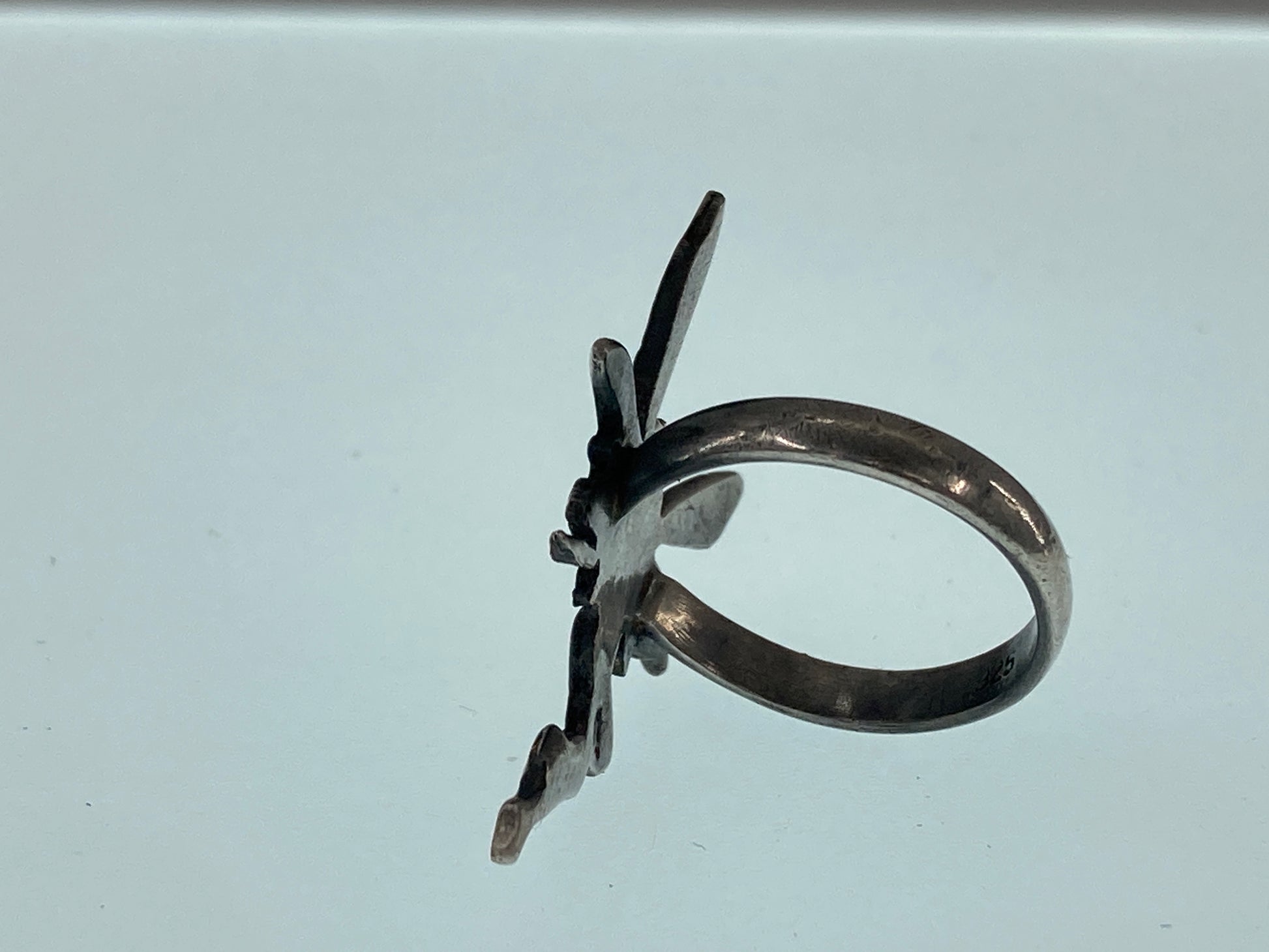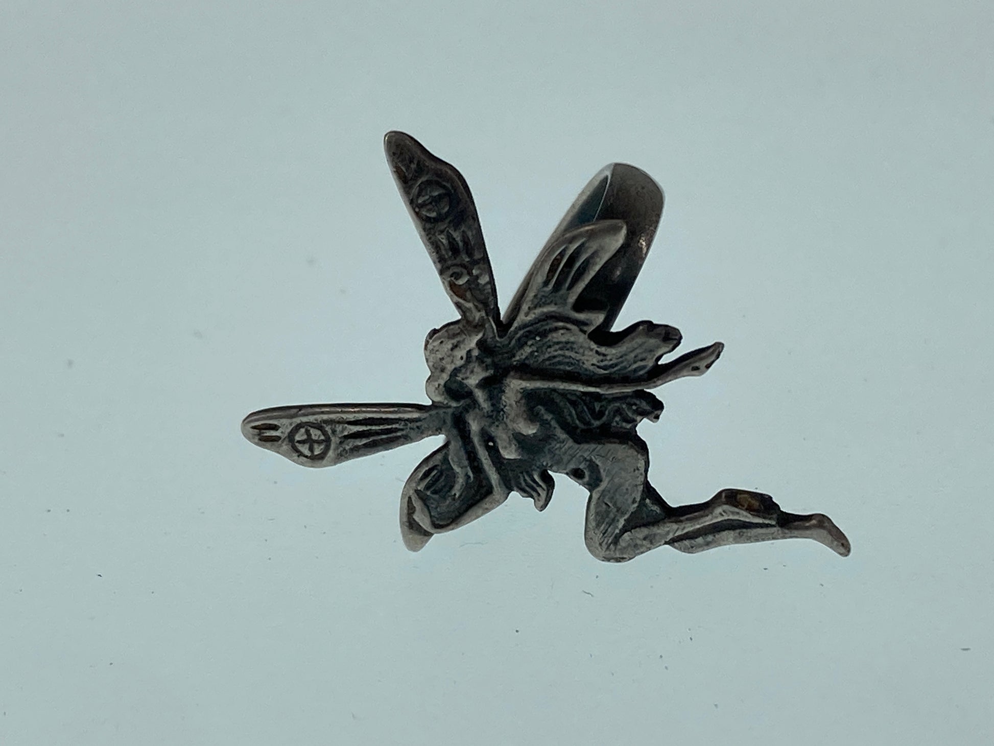 This Fairy was rescued from an Artists recycle pile meant for melting down. We decided she would serve better as a ring so we paired her up with a ring shank that came to us as a broken ring. New life for this pair!